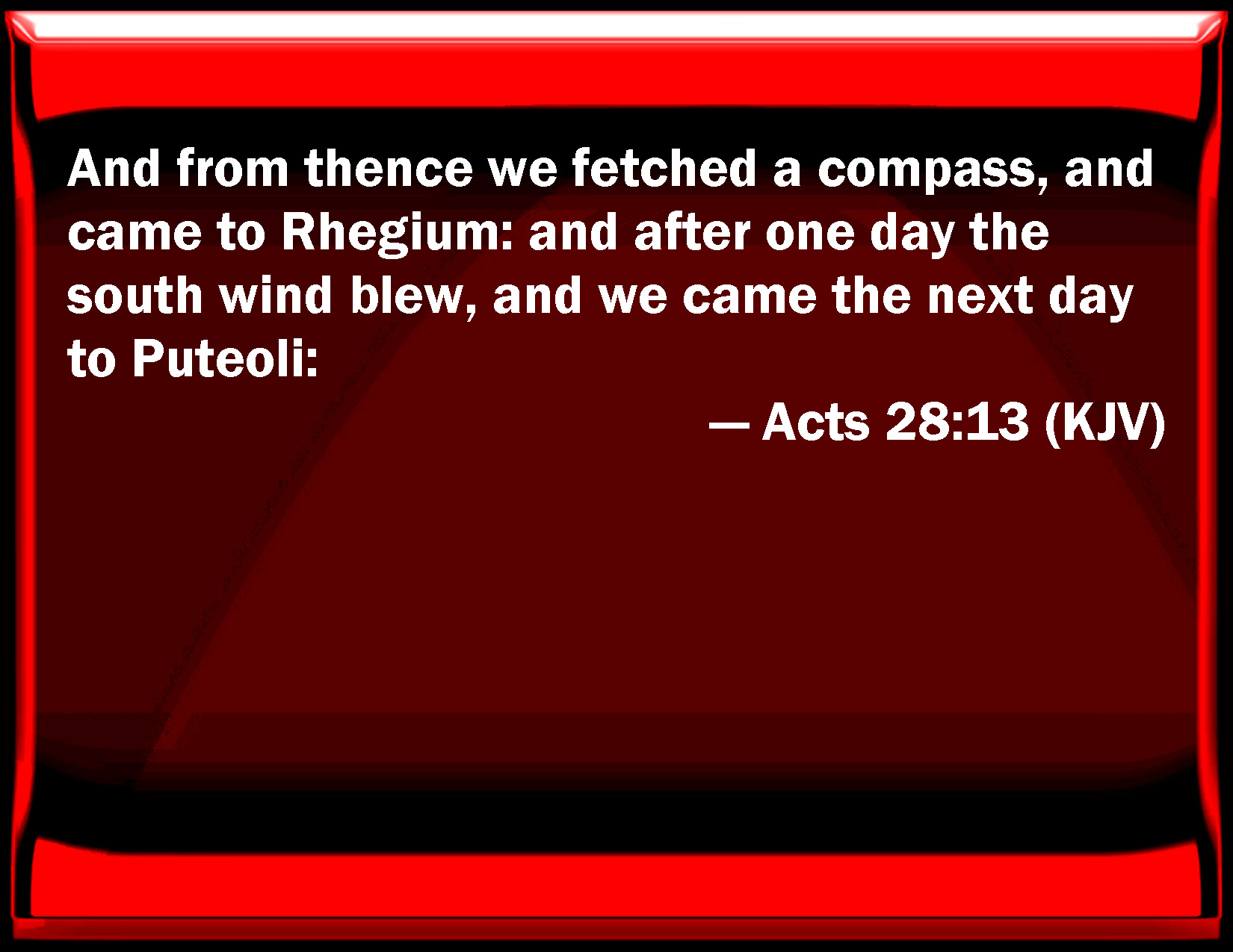Bible Verse Slide Acts 28:13 And from there we fetched a compass, and came to Rhegium: and after one day the south wind blew, and we came the next day to Puteoli: KJV: And from thence we fetched a compass, and came to Rhegium: and after one day the south wind blew, and we came the next day to Puteoli: DRB: From thence, compassing by the shore, we came to Rhegium: and after one day, the south wind blowing, we came the second day to Puteoli; DBT: Whence, going in a circuitous course, we arrived at Rhegium; and after one day, the wind having changed to south, on the second day we came to Puteoli, ERV: And from thence we made a circuit, and arrived at Rhegium: and after one day a south wind sprang up, and on the second day we came to Puteoli: WBT: And from thence we made a circuit, and came to Rhegium: and after one day the south wind blew, and we came the next day to Puteoli: WEB: From there we circled around and arrived at Rhegium. After one day, a south wind sprang up, and on the second day we came to Puteoli, YLT: thence having gone round, we came to Rhegium, and after one day, a south wind having sprung up, the second day we came to Puteoli;Links Acts 28:13 NIV • Acts 28:13 NLT • Acts 28:13 ESV • Acts 28:13 NASB • Acts 28:13 KJV • Acts 28:13 Interlinear • Acts 28:13 Commentaries • Acts 28:13 Parallel Texts • Acts 28:13 Bible Apps • Acts 28:13 Parallel • Bible Hub |