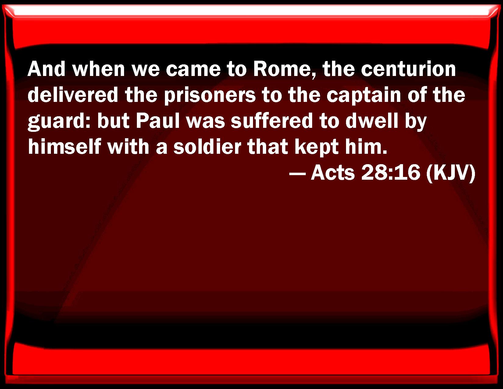 Bible Verse Slide Acts 28:16 And when we came to Rome, the centurion delivered the prisoners to the captain of the guard: but Paul was suffered to dwell by himself with a soldier that kept him. KJV: And when we came to Rome, the centurion delivered the prisoners to the captain of the guard: but Paul was suffered to dwell by himself with a soldier that kept him. DRB: And when we were come to Rome, Paul was suffered to dwell by himself, with a soldier that kept him. DBT: And when we came to Rome, the centurion delivered up the prisoners to the praetorian prefect, but Paul was allowed to remain by himself with the soldier who kept him. ERV: And when we entered into Rome, Paul was suffered to abide by himself with the soldier that guarded him. WBT: And when we came to Rome, the centurion delivered the prisoners to the captain of the guard: but Paul was suffered to dwell by himself, with a soldier that kept him. WEB: When we entered into Rome, the centurion delivered the prisoners to the captain of the guard, but Paul was allowed to stay by himself with the soldier who guarded him. YLT: And when we came to Rome, the centurion delivered up the prisoners to the captain of the barrack, but Paul was suffered to remain by himself, with the soldier guarding him.Links Acts 28:16 NIV • Acts 28:16 NLT • Acts 28:16 ESV • Acts 28:16 NASB • Acts 28:16 KJV • Acts 28:16 Interlinear • Acts 28:16 Commentaries • Acts 28:16 Parallel Texts • Acts 28:16 Bible Apps • Acts 28:16 Parallel • Bible Hub |