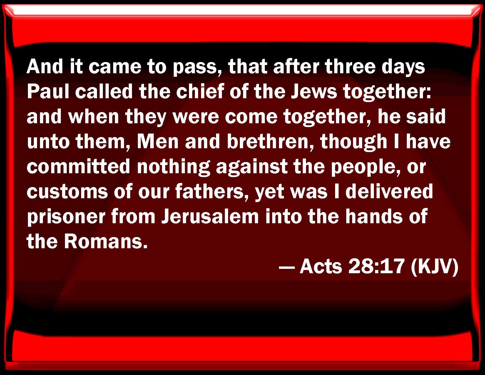 Bible Verse Slide Acts 28:17 And it came to pass, that after three days Paul called the chief of the Jews together: and when they were come together, he said to them, Men and brothers, though I have committed nothing against the people, or customs of our fathers, yet was I delivered prisoner from Jerusalem into the hands of the Romans. KJV: And it came to pass, that after three days Paul called the chief of the Jews together: and when they were come together, he said unto them, Men and brethren, though I have committed nothing against the people, or customs of our fathers, yet was I delivered prisoner from Jerusalem into the hands of the Romans. DRB: And after the third day, he called together the chief of the Jews. And when they were assembled, he said to them: Men, brethren, I, having done nothing against the people, or the custom of our fathers, was delivered prisoner from Jerusalem into the hands of the Romans; DBT: And it came to pass after three days, that he called together those who were the chief of the Jews; and when they had come together he said to them, Brethren, I having done nothing against the people or the customs of our forefathers, have been delivered a prisoner from Jerusalem into the hands of the Romans, ERV: And it came to pass, that after three days he called together those that were the chief of the Jews: and when they were come together, he said unto them, I, brethren, though I had done nothing against the people, or the customs of our fathers, yet was delivered prisoner from Jerusalem into the hands of the Romans: WBT: And it came to pass, that after three days, Paul called together the chief of the Jews. And when they were assembled, he said to them, Men, brethren, though I have committed nothing against the people, or customs of our fathers, yet I was delivered prisoner from Jerusalem into the hands of the Romans. WEB: It happened that after three days Paul called together those who were the leaders of the Jews. When they had come together, he said to them, "I, brothers, though I had done nothing against the people, or the customs of our fathers, still was delivered prisoner from Jerusalem into the hands of the Romans, YLT: And it came to pass after three days, Paul called together those who are the principal men of the Jews, and they having come together, he said unto them: 'Men, brethren, I — having done nothing contrary to the people, or to the customs of the fathers — a prisoner from Jerusalem, was delivered up to the hands of the Romans;Links Acts 28:17 NIV • Acts 28:17 NLT • Acts 28:17 ESV • Acts 28:17 NASB • Acts 28:17 KJV • Acts 28:17 Interlinear • Acts 28:17 Commentaries • Acts 28:17 Parallel Texts • Acts 28:17 Bible Apps • Acts 28:17 Parallel • Bible Hub |