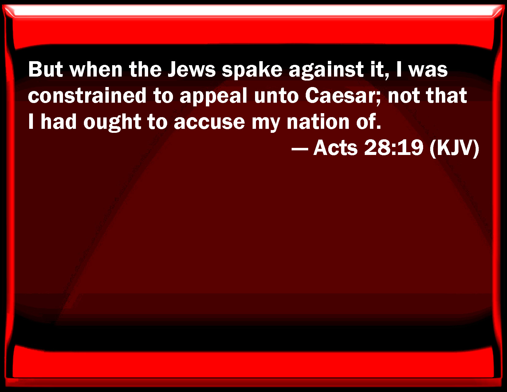 Bible Verse Slide Acts 28:19 But when the Jews spoke against it, I was constrained to appeal to Caesar; not that I had ought to accuse my nation of. KJV: But when the Jews spake against it, I was constrained to appeal unto Caesar; not that I had ought to accuse my nation of. DRB: But the Jews contradicting it, I was constrained to appeal unto Caesar; not that I had any thing to accuse my nation of. DBT: But the Jews speaking against it, I was compelled to appeal to Caesar, not as having anything to accuse my nation of. ERV: But when the Jews spake against it, I was constrained to appeal unto Caesar; not that I had aught to accuse my nation of. WBT: But when the Jews spoke against it, I was constrained to appeal to Cesar; not that I had aught to accuse my nation of. WEB: But when the Jews spoke against it, I was constrained to appeal to Caesar, not that I had anything about which to accuse my nation. YLT: and the Jews having spoken against it, I was constrained to appeal unto Caesar — not as having anything to accuse my nation of;Links Acts 28:19 NIV • Acts 28:19 NLT • Acts 28:19 ESV • Acts 28:19 NASB • Acts 28:19 KJV • Acts 28:19 Interlinear • Acts 28:19 Commentaries • Acts 28:19 Parallel Texts • Acts 28:19 Bible Apps • Acts 28:19 Parallel • Bible Hub |