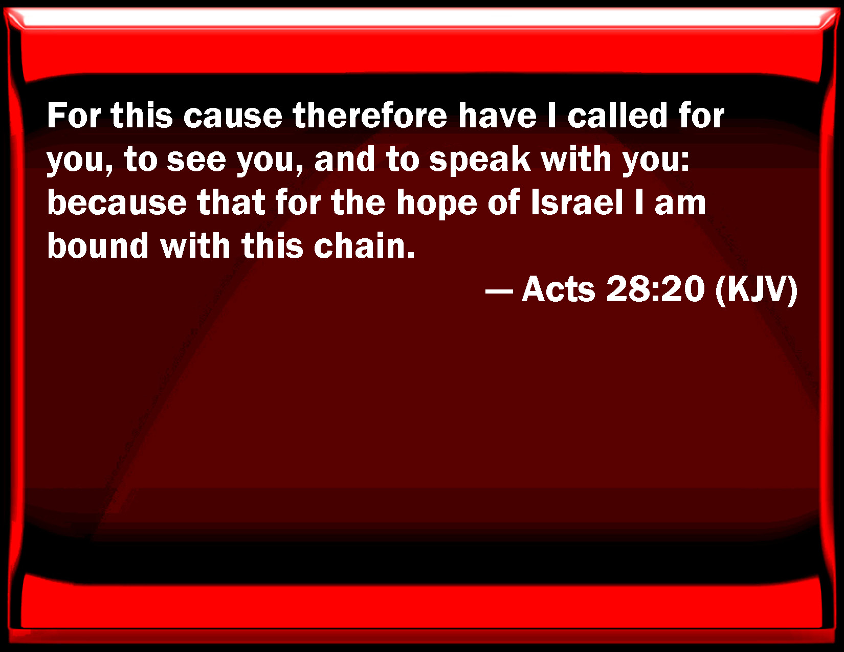 Bible Verse Slide Acts 28:20 For this cause therefore have I called for you, to see you, and to speak with you: because that for the hope of Israel I am bound with this chain. KJV: For this cause therefore have I called for you, to see you, and to speak with you: because that for the hope of Israel I am bound with this chain. DRB: For this cause therefore I desired to see you, and to speak to you. Because that for the hope of Israel, I am bound with this chain. DBT: For this cause therefore I have called you to me to see and to speak to you; for on account of the hope of Israel I have this chain about me. ERV: For this cause therefore did I entreat you to see and to speak with me: for because of the hope of Israel I am bound with this chain. WBT: For this cause therefore have I called for you, to see you, and to speak with you: because that for the hope of Israel I am bound with this chain. WEB: For this cause therefore I asked to see you and to speak with you. For because of the hope of Israel I am bound with this chain." YLT: for this cause, therefore, I called for you to see and to speak with you, for because of the hope of Israel with this chain I am bound.'Links Acts 28:20 NIV • Acts 28:20 NLT • Acts 28:20 ESV • Acts 28:20 NASB • Acts 28:20 KJV • Acts 28:20 Interlinear • Acts 28:20 Commentaries • Acts 28:20 Parallel Texts • Acts 28:20 Bible Apps • Acts 28:20 Parallel • Bible Hub |
