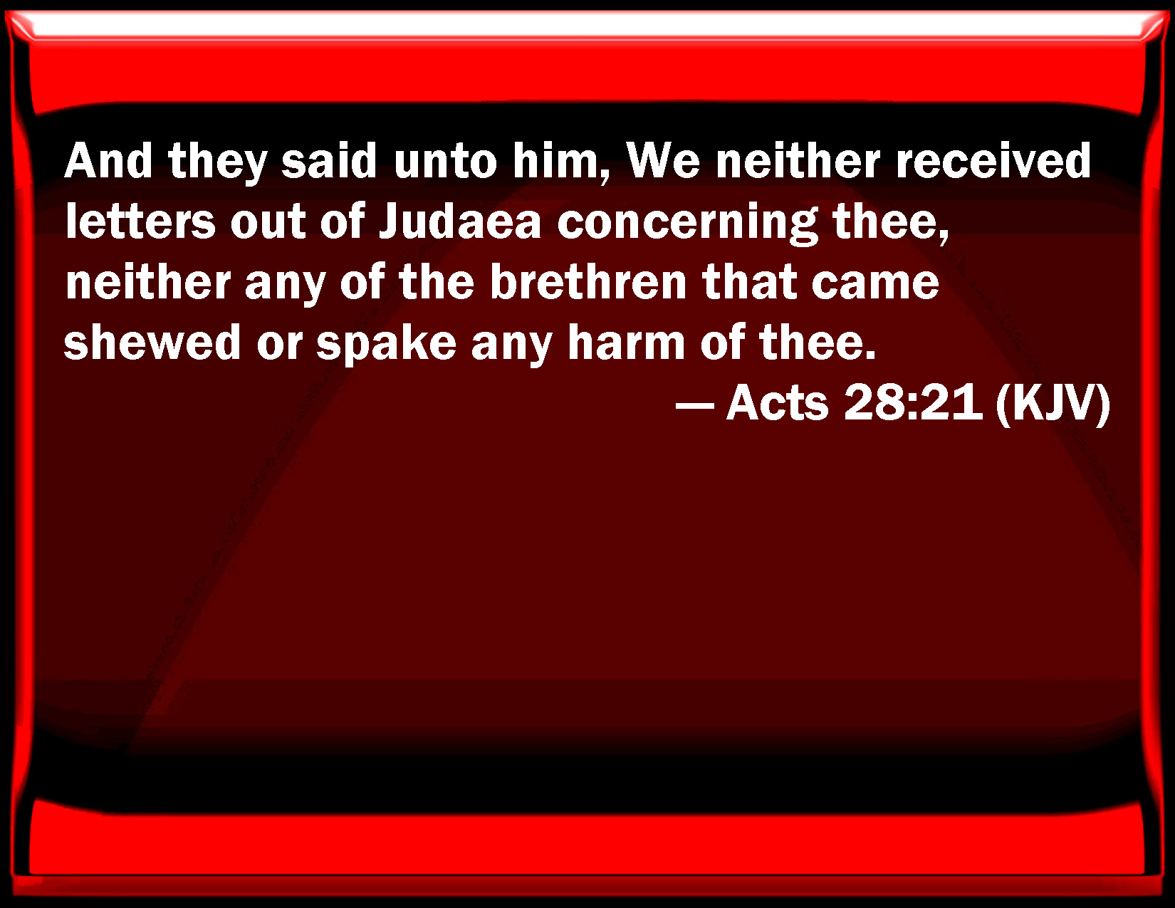 Bible Verse Slide Acts 28:21 And they said to him, We neither received letters out of Judaea concerning you, neither any of the brothers that came showed or spoke any harm of you. KJV: And they said unto him, We neither received letters out of Judaea concerning thee, neither any of the brethren that came shewed or spake any harm of thee. DRB: But they said to him: We neither received letters concerning thee from Judea, neither did any of the brethren that came hither, relate or speak any evil of thee. DBT: And they said to him, For our part, we have neither received letters from Judaea concerning thee, nor has any one of the brethren who has arrived reported or said anything evil concerning thee. ERV: And they said unto him, We neither received letters from Judaea concerning thee, nor did any of the brethren come hither and report or speak any harm of thee. WBT: And they said to him, We have neither received letters from Judea concerning thee, neither have any of the brethren that came shown or spoken any harm of thee. WEB: They said to him, "We neither received letters from Judea concerning you, nor did any of the brothers come here and report or speak any evil of you. YLT: And they said unto him, 'We did neither receive letters concerning thee from Judea, nor did any one who came of the brethren declare or speak any evil concerning thee,Links Acts 28:21 NIV • Acts 28:21 NLT • Acts 28:21 ESV • Acts 28:21 NASB • Acts 28:21 KJV • Acts 28:21 Interlinear • Acts 28:21 Commentaries • Acts 28:21 Parallel Texts • Acts 28:21 Bible Apps • Acts 28:21 Parallel • Bible Hub |
