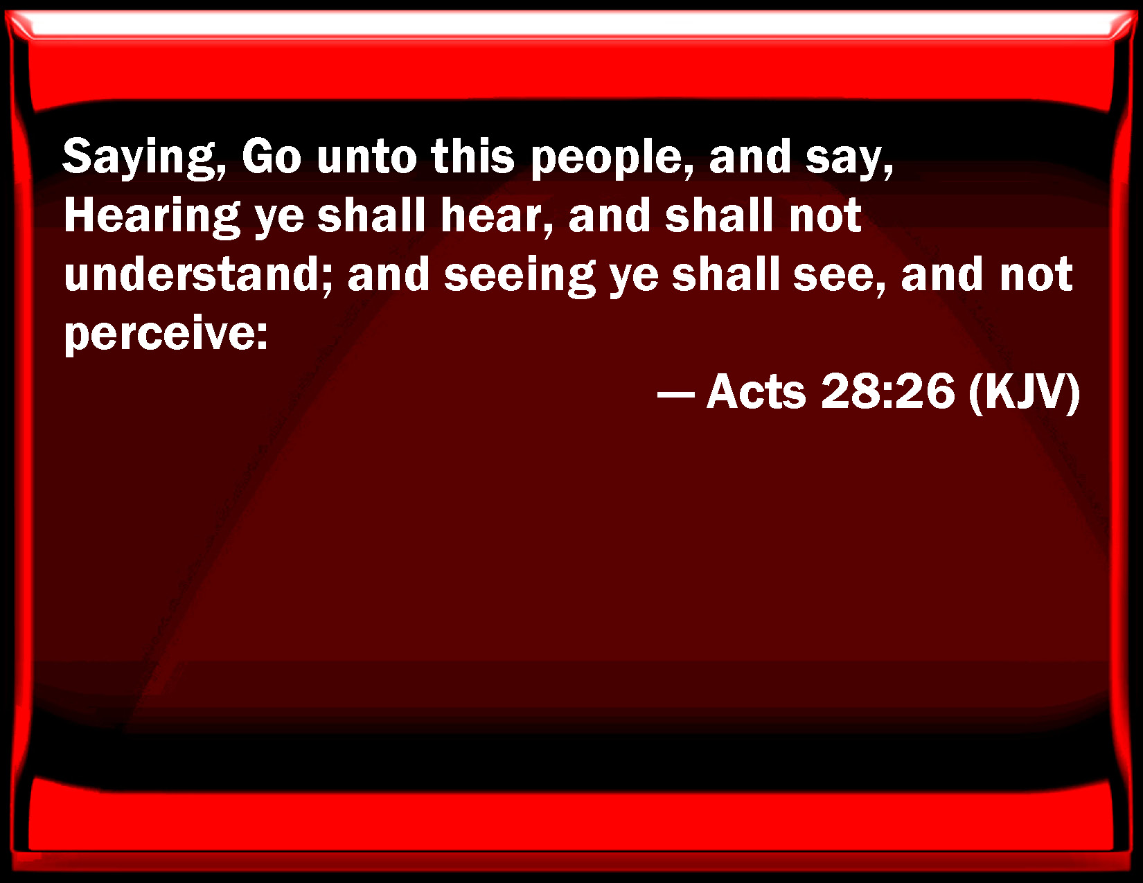 Bible Verse Slide Acts 28:26 Saying, Go to this people, and say, Hearing you shall hear, and shall not understand; and seeing you shall see, and not perceive: KJV: Saying, Go unto this people, and say, Hearing ye shall hear, and shall not understand; and seeing ye shall see, and not perceive: DRB: Saying: Go to this people, and say to them: With the ear you shall hear, and shall not understand; and seeing you shall see, and shall not perceive. DBT: saying, Go to this people, and say, Hearing ye shall hear and not understand, and seeing ye shall see and not perceive. ERV: saying, Go thou unto this people, and say, By hearing ye shall hear, and shall in no wise understand; And seeing ye shall see, and shall in no wise perceive: WBT: Saying, Go to this people, and say, Hearing ye shall hear, and shall not understand; and seeing ye shall see, and not perceive. WEB: saying, 'Go to this people, and say, in hearing, you will hear, but will in no way understand. In seeing, you will see, but will in no way perceive. YLT: saying, Go on unto this people and say, With hearing ye shall hear, and ye shall not understand, and seeing ye shall see, and ye shall not perceive,Links Acts 28:26 NIV • Acts 28:26 NLT • Acts 28:26 ESV • Acts 28:26 NASB • Acts 28:26 KJV • Acts 28:26 Interlinear • Acts 28:26 Commentaries • Acts 28:26 Parallel Texts • Acts 28:26 Bible Apps • Acts 28:26 Parallel • Bible Hub |