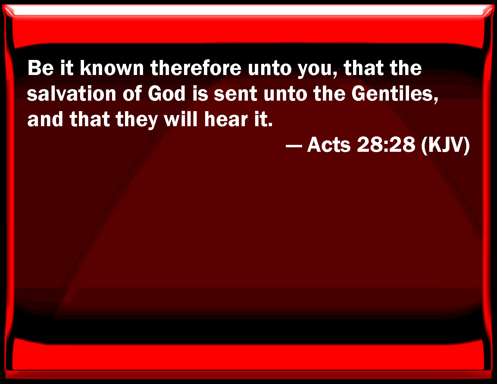 Bible Verse Slide Acts 28:28 Be it known therefore to you, that the salvation of God is sent to the Gentiles, and that they will hear it. KJV: Be it known therefore unto you, that the salvation of God is sent unto the Gentiles, and that they will hear it. DRB: Be it known therefore to you, that this salvation of God is sent to the Gentiles, and they will hear it. DBT: Be it known to you therefore, that this salvation of God has been sent to the nations; they also will hear it. ERV: Be it known therefore unto you, that this salvation of God is sent unto the Gentiles: they will also hear. WBT: Be it known therefore to you, that the salvation of God is sent to the Gentiles, and they will hear it. WEB: "Be it known therefore to you, that the salvation of God is sent to the nations. They will also listen." YLT: 'Be it known, therefore, to you, that to the nations was sent the salvation of God, these also will hear it;'Links Acts 28:28 NIV • Acts 28:28 NLT • Acts 28:28 ESV • Acts 28:28 NASB • Acts 28:28 KJV • Acts 28:28 Interlinear • Acts 28:28 Commentaries • Acts 28:28 Parallel Texts • Acts 28:28 Bible Apps • Acts 28:28 Parallel • Bible Hub |