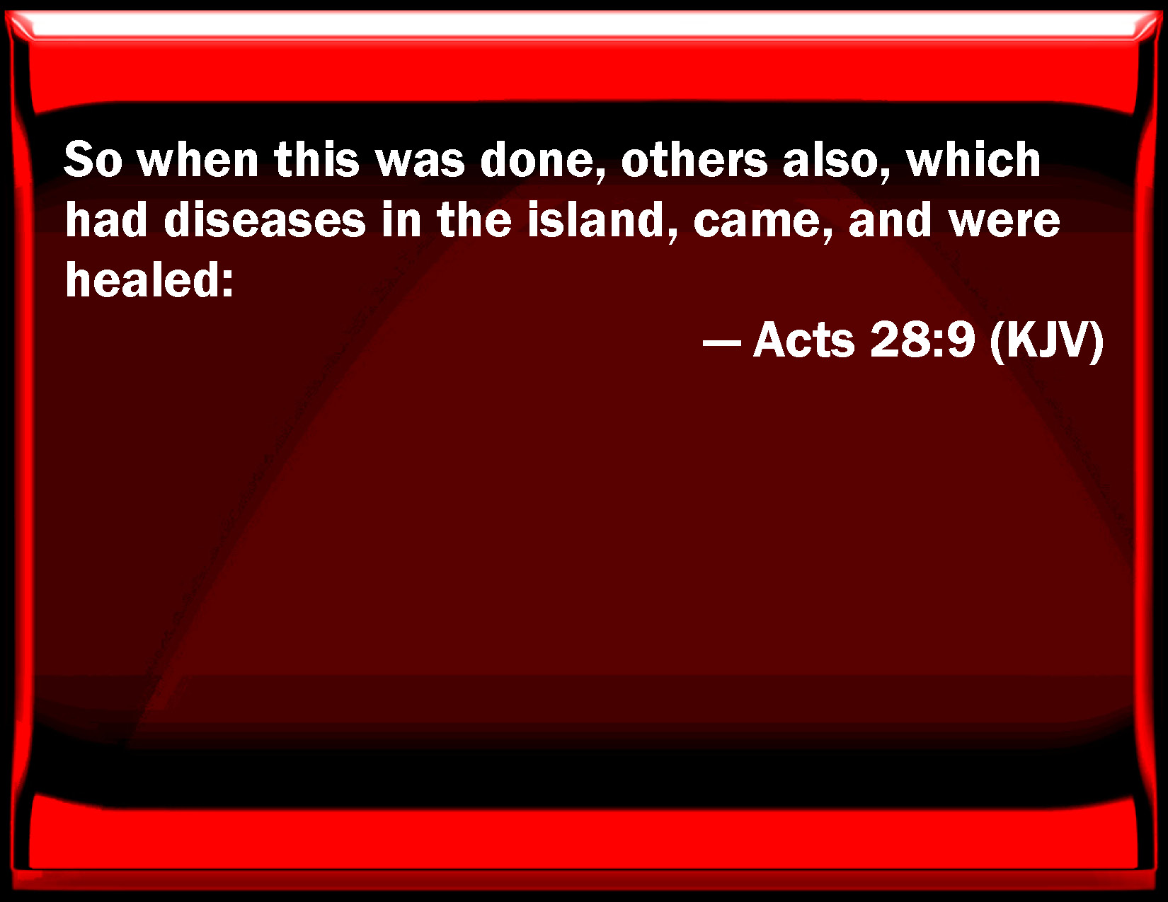 Bible Verse Slide Acts 28:9 So when this was done, others also, which had diseases in the island, came, and were healed: KJV: So when this was done, others also, which had diseases in the island, came, and were healed: DRB: Which being done, all that had diseases in the island, came and were healed: DBT: But this having taken place, the rest also who had sicknesses in the island came and were healed: ERV: And when this was done, the rest also which had diseases in the island came, and were cured: WBT: So when this was done, others also who had diseases in the isle, came, and were healed: WEB: Then when this was done, the rest also who had diseases in the island came, and were cured. YLT: this, therefore, being done, the others also in the island having infirmities were coming and were healed;Links Acts 28:9 NIV • Acts 28:9 NLT • Acts 28:9 ESV • Acts 28:9 NASB • Acts 28:9 KJV • Acts 28:9 Interlinear • Acts 28:9 Commentaries • Acts 28:9 Parallel Texts • Acts 28:9 Bible Apps • Acts 28:9 Parallel • Bible Hub |
