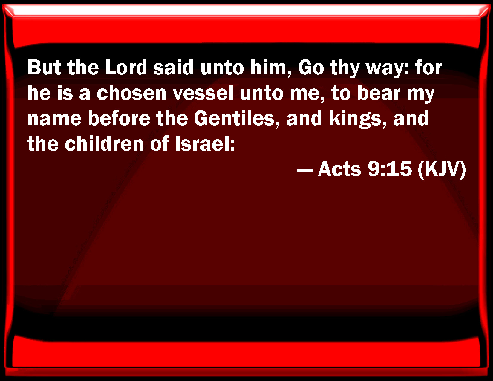 Bible Verse Slide Acts 9:15 But the Lord said to him, Go your way: for he is a chosen vessel to me, to bear my name before the Gentiles, and kings, and the children of Israel: KJV: But the Lord said unto him, Go thy way: for he is a chosen vessel unto me, to bear my name before the Gentiles, and kings, and the children of Israel: DRB: And the Lord said to him: Go thy way; for this man is to me a vessel of election, to carry my name before the Gentiles, and kings, and the children of Israel. DBT: And the Lord said to him, Go, for this man is an elect vessel to me, to bear my name before both nations and kings and the sons of Israel: ERV: But the Lord said unto him, Go thy way: for he is a chosen vessel unto me, to bear my name before the Gentiles and kings, and the children of Israel: WBT: But the Lord said to him, Go, for he is a chosen vessel to me, to bear my name before the Gentiles, and kings, and the children of Israel. WEB: But the Lord said to him, "Go your way, for he is my chosen vessel to bear my name before the nations and kings, and the children of Israel. YLT: And the Lord said unto him, 'Be going on, because a choice vessel to Me is this one, to bear My name before nations and kings — the sons also of Israel;Links Acts 9:15 NIV • Acts 9:15 NLT • Acts 9:15 ESV • Acts 9:15 NASB • Acts 9:15 KJV • Acts 9:15 Interlinear • Acts 9:15 Commentaries • Acts 9:15 Parallel Texts • Acts 9:15 Bible Apps • Acts 9:15 Parallel • Bible Hub |