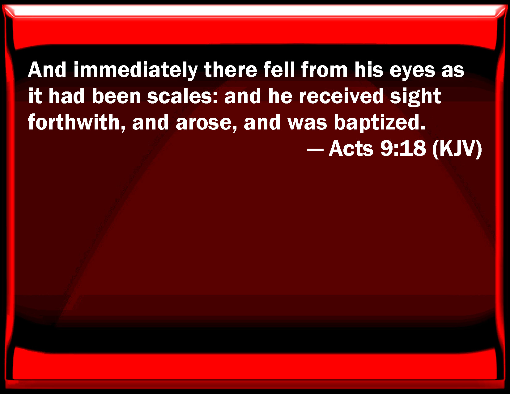 Bible Verse Slide Acts 9:18 And immediately there fell from his eyes as it had been scales: and he received sight immediately, and arose, and was baptized. KJV: And immediately there fell from his eyes as it had been scales: and he received sight forthwith, and arose, and was baptized. DRB: And immediately there fell from his eyes as it were scales, and he received his sight; and rising up, he was baptized. DBT: And straightway there fell from his eyes as it were scales, and he saw, and rising up was baptised; ERV: And straightway there fell from his eyes as it were scales, and he received his sight; and he arose and was baptized; WBT: And immediately there fell from his eyes as it had been scales: and he received sight forthwith, and arose, and was baptized. WEB: Immediately something like scales fell from his eyes, and he received his sight. He arose and was baptized. YLT: And immediately there fell from his eyes as it were scales, he saw again also presently, and having risen, was baptized,Links Acts 9:18 NIV • Acts 9:18 NLT • Acts 9:18 ESV • Acts 9:18 NASB • Acts 9:18 KJV • Acts 9:18 Interlinear • Acts 9:18 Commentaries • Acts 9:18 Parallel Texts • Acts 9:18 Bible Apps • Acts 9:18 Parallel • Bible Hub |
