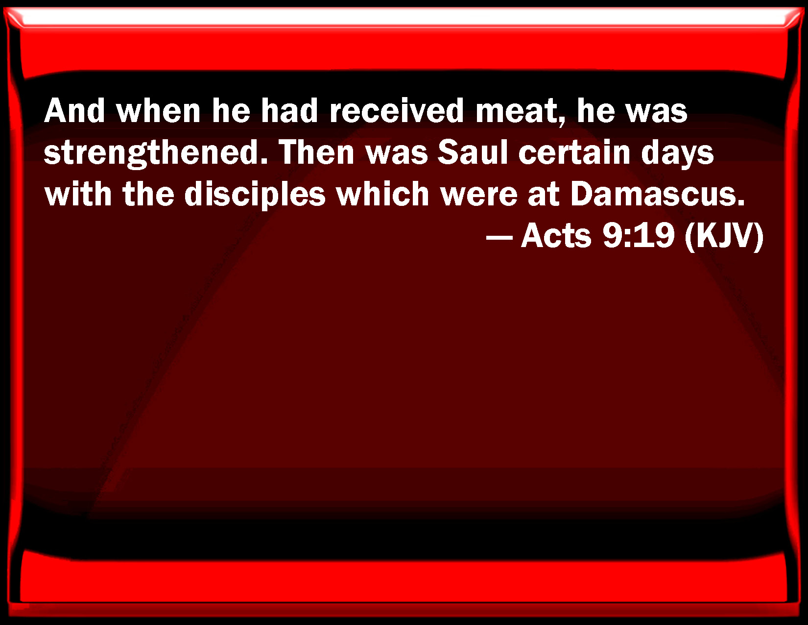 Bible Verse Slide Acts 9:19 And when he had received meat, he was strengthened. Then was Saul certain days with the disciples which were at Damascus. KJV: And when he had received meat, he was strengthened. Then was Saul certain days with the disciples which were at Damascus. DRB: And when he had taken meat, he was strengthened. And he was with the disciples that were at Damascus, for some days. DBT: and, having received food, got strength. And he was with the disciples who were in Damascus certain days. ERV: and he took food and was strengthened. And he was certain days with the disciples which were at Damascus. WBT: And when he had received food, he was strengthened. Then was Saul certain days with the disciples who were at Damascus. WEB: He took food and was strengthened. Saul stayed several days with the disciples who were at Damascus. YLT: and having received nourishment, was strengthened, and Saul was with the disciples in Damascus certain days,Links Acts 9:19 NIV • Acts 9:19 NLT • Acts 9:19 ESV • Acts 9:19 NASB • Acts 9:19 KJV • Acts 9:19 Interlinear • Acts 9:19 Commentaries • Acts 9:19 Parallel Texts • Acts 9:19 Bible Apps • Acts 9:19 Parallel • Bible Hub |