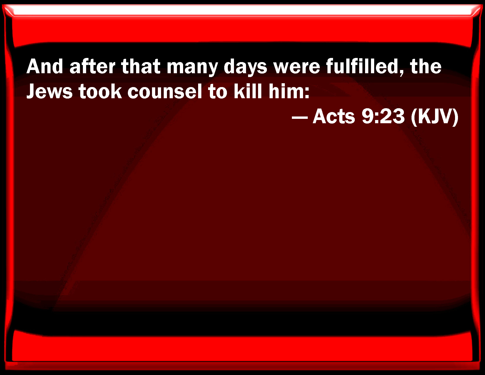 Bible Verse Slide Acts 9:23 And after that many days were fulfilled, the Jews took counsel to kill him: KJV: And after that many days were fulfilled, the Jews took counsel to kill him: DRB: And when many days were passed, the Jews consulted together to kill him. DBT: Now when many days were fulfilled, the Jews consulted together to kill him. ERV: And when many days were fulfilled, the Jews took counsel together to kill him: WBT: And after many days were fulfilled, the Jews took counsel to kill him. WEB: When many days were fulfilled, the Jews conspired together to kill him, YLT: And when many days were fulfilled, the Jews took counsel together to kill him,Links Acts 9:23 NIV • Acts 9:23 NLT • Acts 9:23 ESV • Acts 9:23 NASB • Acts 9:23 KJV • Acts 9:23 Interlinear • Acts 9:23 Commentaries • Acts 9:23 Parallel Texts • Acts 9:23 Bible Apps • Acts 9:23 Parallel • Bible Hub |