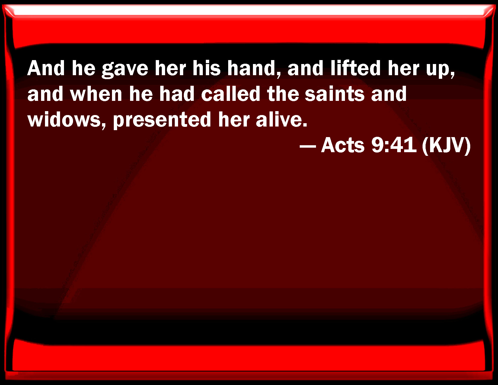 Bible Verse Slide Acts 9:41 And he gave her his hand, and lifted her up, and when he had called the saints and widows, presented her alive. KJV: And he gave her his hand, and lifted her up, and when he had called the saints and widows, presented her alive. DRB: And giving her his hand, he lifted her up. And when he had called the saints and the widows, he presented her alive. DBT: And having given her his hand, he raised her up, and having called the saints and the widows, presented her living. ERV: And he gave her his hand, and raised her up; and calling the saints and widows, he presented her alive. WBT: And he gave her his hand, and lifted her up; and when he had called the saints and widows, presented her alive. WEB: He gave her his hand, and raised her up. Calling the saints and widows, he presented her alive. YLT: and having given her his hand, he lifted her up, and having called the saints and the widows, he presented her alive,Links Acts 9:41 NIV • Acts 9:41 NLT • Acts 9:41 ESV • Acts 9:41 NASB • Acts 9:41 KJV • Acts 9:41 Interlinear • Acts 9:41 Commentaries • Acts 9:41 Parallel Texts • Acts 9:41 Bible Apps • Acts 9:41 Parallel • Bible Hub |