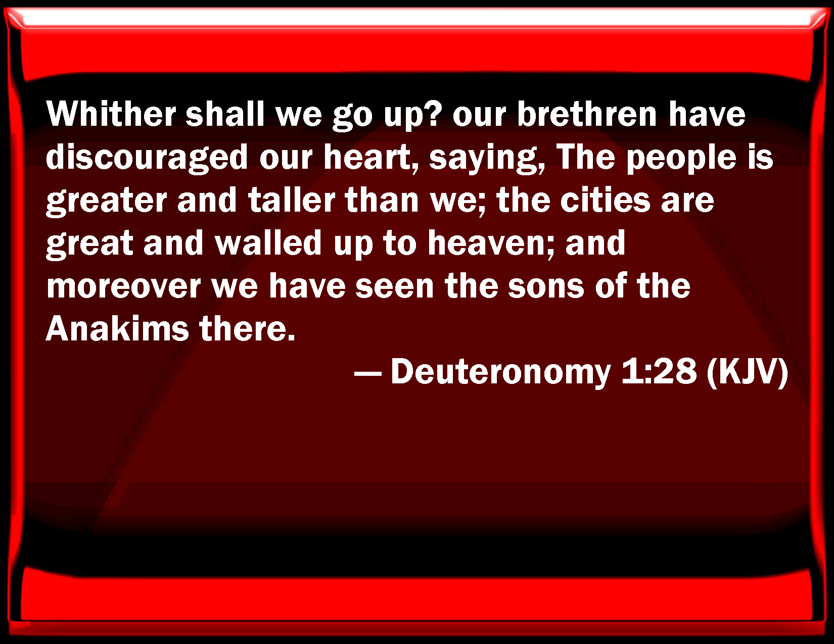 Bible Verse Slide Deuteronomy 1:28 Where shall we go up? our brothers have discouraged our heart, saying, The people is greater and taller than we; the cities are great and walled up to heaven; and moreover we have seen the sons of the Anakims there. KJV: Whither shall we go up? our brethren have discouraged our heart, saying, The people is greater and taller than we; the cities are great and walled up to heaven; and moreover we have seen the sons of the Anakims there. DRB: Whither shall we go up? the messengers have terrified our hearts, saying: The multitude is very great, and taller than we: the cities are great, and walled up td the sky, we have seen the sons of the Enacims there. DBT: Whither shall we go up? Our brethren have made our hearts melt, saying, They are a people greater and taller than we; the cities are great and walled up to heaven; and moreover we have seen the sons of the Anakim there. ERV: Whither are we going up? our brethren have made our heart to melt, saying, The people is greater and taller than we; the cities are great and fenced up to heaven; and moreover we have seen the sons of the Anakim there. WBT: Whither shall we go up? our brethren have discouraged our heart, saying, The people are greater and taller than we; the cities are great and walled up to heaven; and moreover, we have seen the sons of the Anakims there. WEB: Where are we going up? our brothers have made our heart to melt, saying, 'The people are greater and taller than we; the cities are great and fortified up to the sky; and moreover we have seen the sons of the Anakim there.'" YLT: whither are we going up? our brethren have melted our heart, saying, A people greater and taller than we, cities great and fenced to heaven, and also sons of Anakim — we have seen there.Links Deuteronomy 1:28 NIV • Deuteronomy 1:28 NLT • Deuteronomy 1:28 ESV • Deuteronomy 1:28 NASB • Deuteronomy 1:28 KJV • Deuteronomy 1:28 Interlinear • Deuteronomy 1:28 Commentaries • Deuteronomy 1:28 Parallel Texts • Deuteronomy 1:28 Bible Apps • Deuteronomy 1:28 Parallel • Bible Hub |