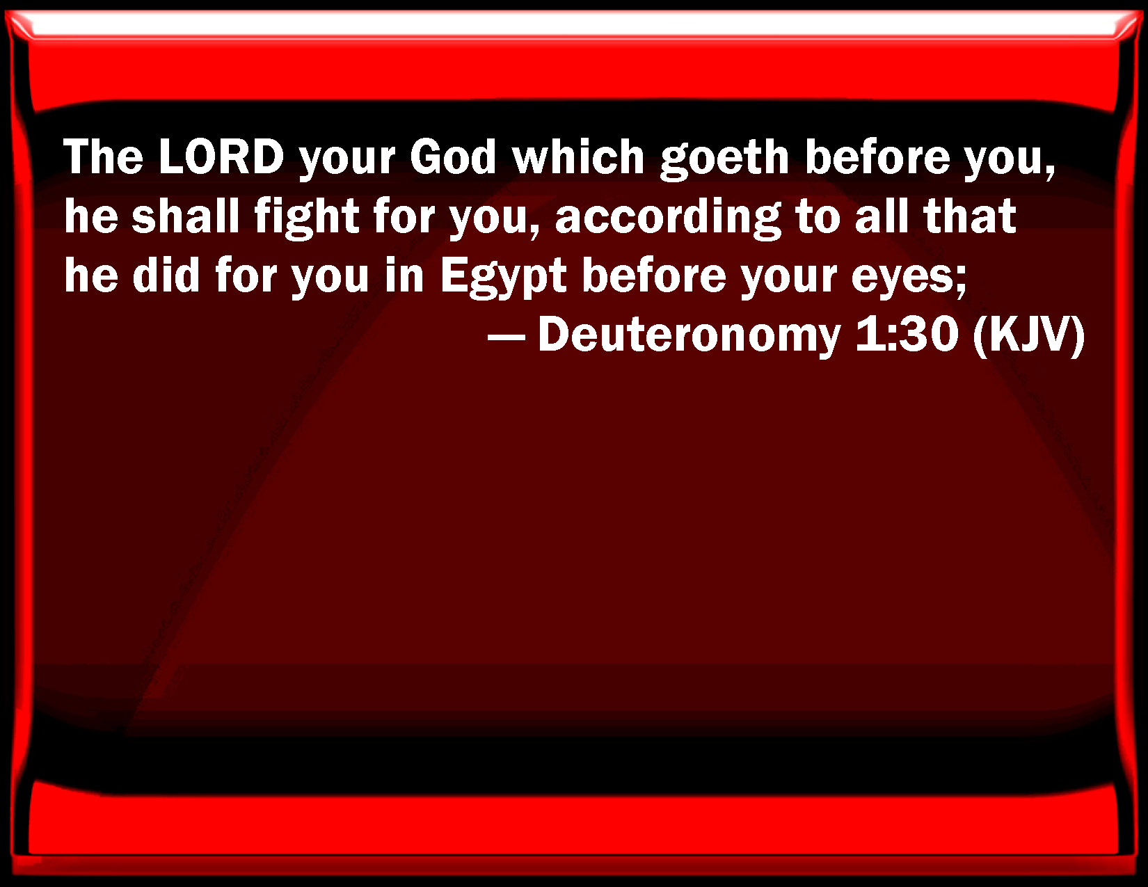 Bible Verse Slide Deuteronomy 1:30 The LORD your God which goes before you, he shall fight for you, according to all that he did for you in Egypt before your eyes; KJV: The LORD your God which goeth before you, he shall fight for you, according to all that he did for you in Egypt before your eyes; DRB: The Lord God, who is your leader, himself will fight for you, as he did in Egypt in the sight of all. DBT: Jehovah your God who goeth before you, he will fight for you, according to all that he did for you in Egypt before your eyes; ERV: The LORD your God who goeth before you, he shall fight for you, according to all that he did for you in Egypt before your eyes; WBT: The LORD your God who goeth before you; he shall fight for you, according to all that he did for you in Egypt before your eyes; WEB: Yahweh your God who goes before you, he will fight for you, according to all that he did for you in Egypt before your eyes, YLT: Jehovah your God, who is going before you — He doth fight for you, according to all that He hath done with you in Egypt before your eyes,Links Deuteronomy 1:30 NIV • Deuteronomy 1:30 NLT • Deuteronomy 1:30 ESV • Deuteronomy 1:30 NASB • Deuteronomy 1:30 KJV • Deuteronomy 1:30 Interlinear • Deuteronomy 1:30 Commentaries • Deuteronomy 1:30 Parallel Texts • Deuteronomy 1:30 Bible Apps • Deuteronomy 1:30 Parallel • Bible Hub |