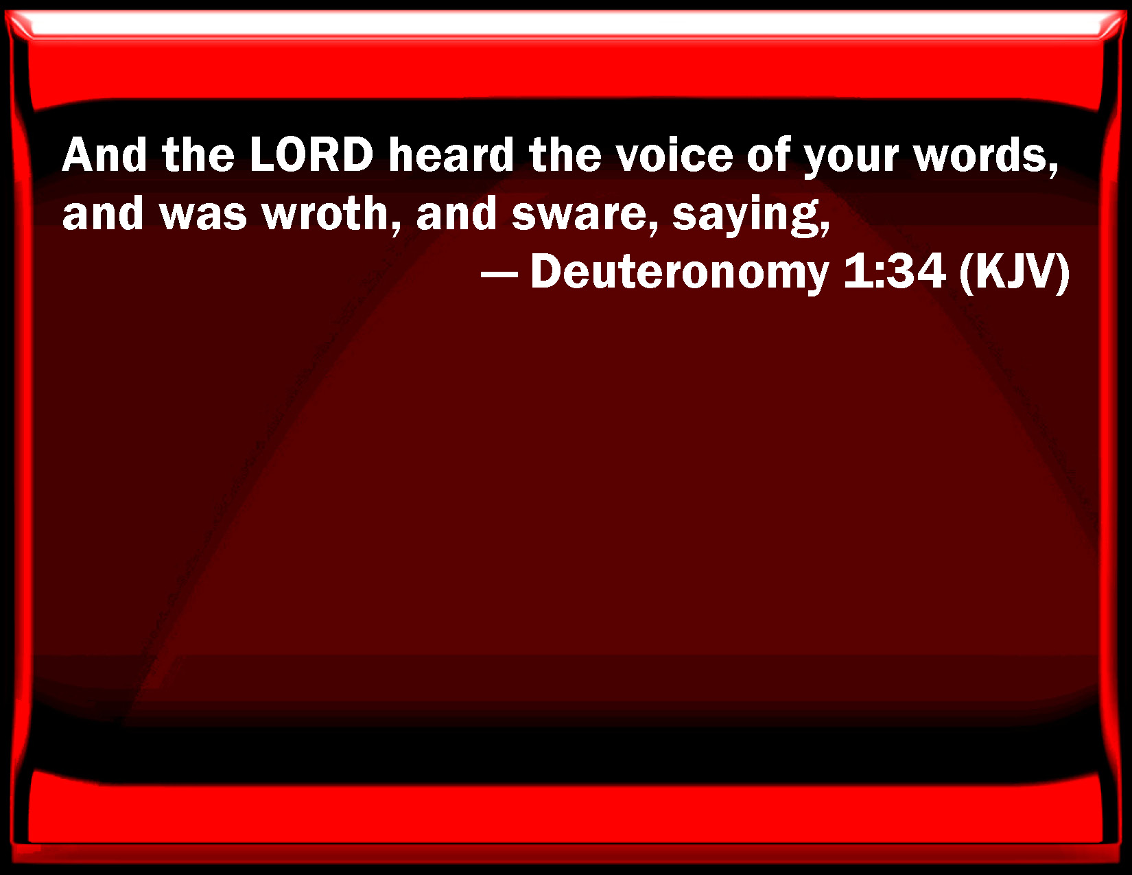 Bible Verse Slide Deuteronomy 1:34 And the LORD heard the voice of your words, and was wroth, and swore, saying, KJV: And the LORD heard the voice of your words, and was wroth, and sware, saying, DRB: And when the Lord had heard the voice of your words, he was angry and swore, and said: DBT: And Jehovah heard the voice of your words, and was wroth, and swore, saying, ERV: And the LORD heard the voice of your words, and was wroth, and sware, saying, WBT: And the LORD heard the voice of your words, and was wroth, and swore, saying, WEB: Yahweh heard the voice of your words, and was angry, and swore, saying, YLT: 'And Jehovah heareth the voice of your words, and is wroth, and sweareth, saying,Links Deuteronomy 1:34 NIV • Deuteronomy 1:34 NLT • Deuteronomy 1:34 ESV • Deuteronomy 1:34 NASB • Deuteronomy 1:34 KJV • Deuteronomy 1:34 Interlinear • Deuteronomy 1:34 Commentaries • Deuteronomy 1:34 Parallel Texts • Deuteronomy 1:34 Bible Apps • Deuteronomy 1:34 Parallel • Bible Hub |