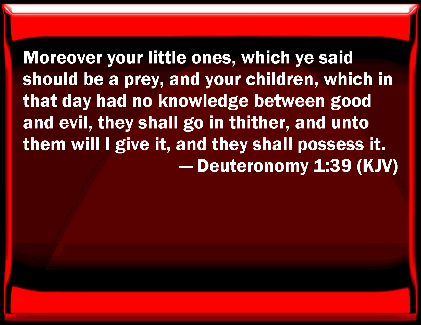 Bible Verse Slide Deuteronomy 1:39 Moreover your little ones, which you said should be a prey, and your children, which in that day had no knowledge between good and evil, they shall go in thither, and to them will I give it, and they shall possess it. KJV: Moreover your little ones, which ye said should be a prey, and your children, which in that day had no knowledge between good and evil, they shall go in thither, and unto them will I give it, and they shall possess it. DRB: Your children, of whom you said that they should be led away captives, and your sons who know not this day the difference of good and evil, they shall go in: and to them I will give the land, and they shall possess it. DBT: And your little ones, of whom ye said, They shall be a prey, and your children, who this day know neither good nor evil, they shall go in thither, and unto them will I give it, and they shall possess it. ERV: Moreover your little ones, which ye said should be a prey, and your children, which this day have no knowledge of good or evil, they shall go in thither, and unto them will I give it, and they shall possess it. WBT: Moreover, your little ones, which ye said should be a prey, and your children, which in that day had no knowledge between good and evil, they shall go in thither, and to them will I give it, and they shall possess it. WEB: Moreover your little ones, whom you said should be a prey, and your children, who this day have no knowledge of good or evil, they shall go in there, and to them will I give it, and they shall possess it. YLT: 'And your infants, of whom ye have said, For a prey they are, and your sons who have not known to-day good and evil, they go in thither, and to them I give it, and they possess it;Links Deuteronomy 1:39 NIV • Deuteronomy 1:39 NLT • Deuteronomy 1:39 ESV • Deuteronomy 1:39 NASB • Deuteronomy 1:39 KJV • Deuteronomy 1:39 Interlinear • Deuteronomy 1:39 Commentaries • Deuteronomy 1:39 Parallel Texts • Deuteronomy 1:39 Bible Apps • Deuteronomy 1:39 Parallel • Bible Hub |