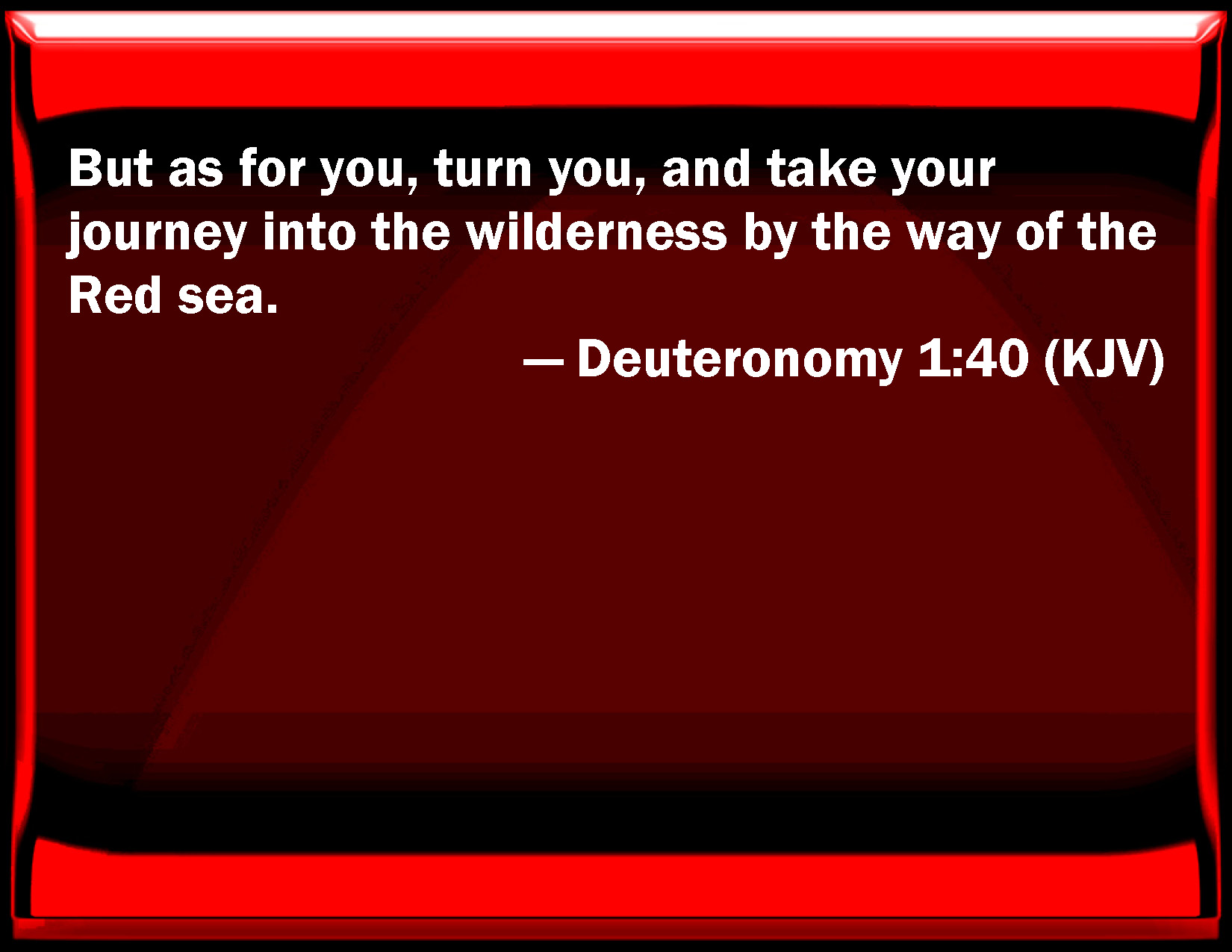 Bible Verse Slide Deuteronomy 1:40 But as for you, turn you, and take your journey into the wilderness by the way of the Red sea. KJV: But as for you, turn you, and take your journey into the wilderness by the way of the Red sea. DRB: But return you and go into the wilderness by the way of the Red Sea. DBT: But ye, turn, and take your journey into the wilderness by the way of the Red sea. ERV: But as for you, turn you, and take your journey into the wilderness by the way to the Red Sea. WBT: But as for you, turn ye, and take your journey into the wilderness by the way of the Red sea. WEB: But as for you, turn, and take your journey into the wilderness by the way to the Red Sea." YLT: and ye, turn for yourselves, and journey toward the wilderness, the way of the Red Sea.Links Deuteronomy 1:40 NIV • Deuteronomy 1:40 NLT • Deuteronomy 1:40 ESV • Deuteronomy 1:40 NASB • Deuteronomy 1:40 KJV • Deuteronomy 1:40 Interlinear • Deuteronomy 1:40 Commentaries • Deuteronomy 1:40 Parallel Texts • Deuteronomy 1:40 Bible Apps • Deuteronomy 1:40 Parallel • Bible Hub |