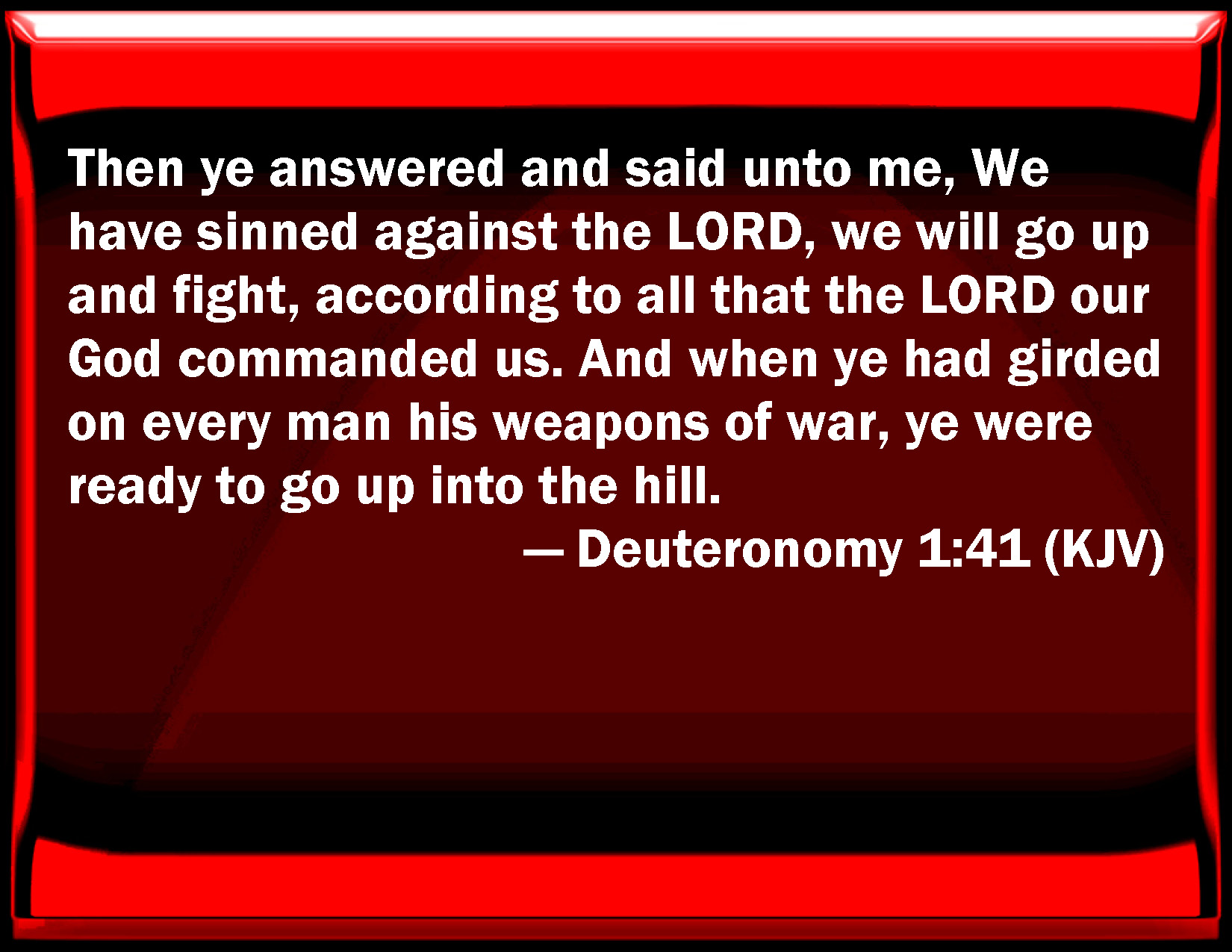 Bible Verse Slide Deuteronomy 1:41 Then you answered and said to me, We have sinned against the LORD, we will go up and fight, according to all that the LORD our God commanded us. And when you had girded on every man his weapons of war, you were ready to go up into the hill. KJV: Then ye answered and said unto me, We have sinned against the LORD, we will go up and fight, according to all that the LORD our God commanded us. And when ye had girded on every man his weapons of war, ye were ready to go up into the hill. DRB: And you answered me: We have sinned against the Lord: we will go up and fight, as the Lord our God hath commanded. And when you went ready armed unto the mountain, DBT: And ye answered And said unto me, We have sinned against Jehovah, We will go up And fight, according to all that Jehovah our God hath commanded us. And ye girded on Every man his weapons of war, And ye would go presumptuously up the hill. ERV: Then ye answered and said unto me, We have sinned against the LORD, we will go up and fight, according to all that the LORD our God commanded us. And ye girded on every man his weapons of war, and were forward to go up into the mountain. WBT: Then ye answered and said to me, We have sinned against the LORD, we will go up and fight, according to all that the LORD our God commanded us. And when ye had girded on every man his weapons of war, ye were ready to ascend the hill. WEB: Then you answered and said to me, "We have sinned against Yahweh, we will go up and fight, according to all that Yahweh our God commanded us." Every man of you put on his weapons of war, and presumed to go up into the hill country. YLT: And ye answer and say unto me, We have sinned against Jehovah; we — we go up, and we have fought, according to all that which Jehovah our God hath commanded us; and ye gird on each his weapons of war, and ye are ready to go up into the hill-country;Links Deuteronomy 1:41 NIV • Deuteronomy 1:41 NLT • Deuteronomy 1:41 ESV • Deuteronomy 1:41 NASB • Deuteronomy 1:41 KJV • Deuteronomy 1:41 Interlinear • Deuteronomy 1:41 Commentaries • Deuteronomy 1:41 Parallel Texts • Deuteronomy 1:41 Bible Apps • Deuteronomy 1:41 Parallel • Bible Hub |