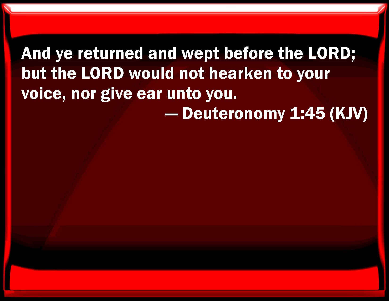 Bible Verse Slide Deuteronomy 1:45 And you returned and wept before the LORD; but the LORD would not listen to your voice, nor give ear to you. KJV: And ye returned and wept before the LORD; but the LORD would not hearken to your voice, nor give ear unto you. DRB: And when you returned and wept before the Lord, he heard you not, neither would he yield to ;your voice. DBT: And ye returned and wept before Jehovah, but Jehovah would not listen to your voice, nor give ear unto you. ERV: And ye returned and wept before the LORD; but the LORD hearkened not to your voice, nor gave ear unto you. WBT: And ye returned and wept before the LORD; but the LORD would not hearken to your voice, nor give ear to you. WEB: You returned and wept before Yahweh; but Yahweh didn't listen to your voice, nor gave ear to you. YLT: 'And ye turn back and weep before Jehovah, and Jehovah hath not hearkened to your voice, nor hath he given ear unto you;Links Deuteronomy 1:45 NIV • Deuteronomy 1:45 NLT • Deuteronomy 1:45 ESV • Deuteronomy 1:45 NASB • Deuteronomy 1:45 KJV • Deuteronomy 1:45 Interlinear • Deuteronomy 1:45 Commentaries • Deuteronomy 1:45 Parallel Texts • Deuteronomy 1:45 Bible Apps • Deuteronomy 1:45 Parallel • Bible Hub |