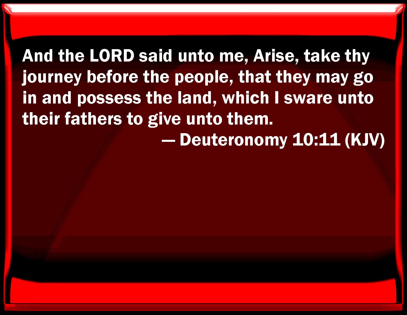 Bible Verse Slide Deuteronomy 10:11 And the LORD said to me, Arise, take your journey before the people, that they may go in and possess the land, which I swore to their fathers to give to them. KJV: And the LORD said unto me, Arise, take thy journey before the people, that they may go in and possess the land, which I sware unto their fathers to give unto them. DRB: And he said to me: Go, and walk before the people, that they may enter, and possess the land, which I swore to their fathers that I would give them. DBT: And Jehovah said unto me, Rise up, take thy journey before the people, that they may enter in and possess the land, which I swore unto their fathers to give unto them. ERV: And the LORD said unto me, Arise, take thy journey before the people; and they shall go in and possess the land, which I sware unto their fathers to give unto them. WBT: And the LORD said to me, Arise, take thy journey before the people, that they may go in and possess the land, which I swore to their fathers to give to them. WEB: Yahweh said to me, "Arise, take your journey before the people; and they shall go in and possess the land, which I swore to their fathers to give to them." YLT: 'And Jehovah saith unto me, Rise, go to journey before the people, and they go in and possess the land which I have sworn to their fathers to give to them.Links Deuteronomy 10:11 NIV • Deuteronomy 10:11 NLT • Deuteronomy 10:11 ESV • Deuteronomy 10:11 NASB • Deuteronomy 10:11 KJV • Deuteronomy 10:11 Interlinear • Deuteronomy 10:11 Commentaries • Deuteronomy 10:11 Parallel Texts • Deuteronomy 10:11 Bible Apps • Deuteronomy 10:11 Parallel • Bible Hub |