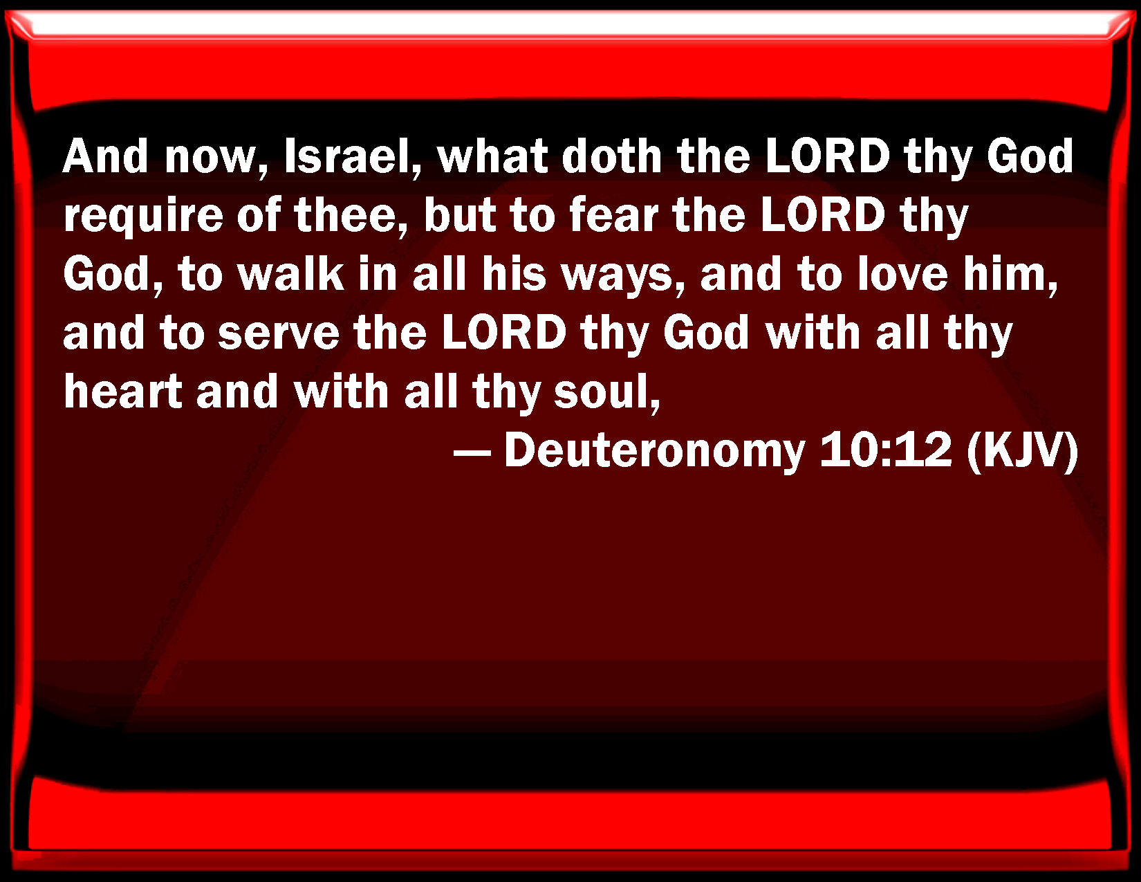 Bible Verse Slide Deuteronomy 10:12 And now, Israel, what does the LORD your God require of you, but to fear the LORD your God, to walk in all his ways, and to love him, and to serve the LORD your God with all your heart and with all your soul, KJV: And now, Israel, what doth the LORD thy God require of thee, but to fear the LORD thy God, to walk in all his ways, and to love him, and to serve the LORD thy God with all thy heart and with all thy soul, DRB: And now, Israel, what doth the Lord thy God require of thee, but that thou fear the Lord thy God, and walk in his ways, and love him, and serve the Lord thy God, with all thy heart, and with all thy soul: DBT: And now, Israel, what doth Jehovah thy God require of thee, but to fear Jehovah thy God, to walk in all his ways, and to love him, and to serve Jehovah thy God with all thy heart and with all thy soul, ERV: And now, Israel, what doth the LORD thy God require of thee, but to fear the LORD thy God, to walk in all his ways, and to love him, and to serve the LORD thy God with all thy heart and with all thy soul, WBT: And now, Israel, what doth the LORD thy God require of thee, but to fear the LORD thy God, to walk in all his ways, and to love him, and to serve the LORD thy God with all thy heart and with all thy soul, WEB: Now, Israel, what does Yahweh your God require of you, but to fear Yahweh your God, to walk in all his ways, and to love him, and to serve Yahweh your God with all your heart and with all your soul, YLT: 'And now, Israel, what is Jehovah thy God asking from thee, except to fear Jehovah thy God, to walk in all His ways, and to love Him, and to serve Jehovah thy God with all thy heart, and with all thy soul,Links Deuteronomy 10:12 NIV • Deuteronomy 10:12 NLT • Deuteronomy 10:12 ESV • Deuteronomy 10:12 NASB • Deuteronomy 10:12 KJV • Deuteronomy 10:12 Interlinear • Deuteronomy 10:12 Commentaries • Deuteronomy 10:12 Parallel Texts • Deuteronomy 10:12 Bible Apps • Deuteronomy 10:12 Parallel • Bible Hub |