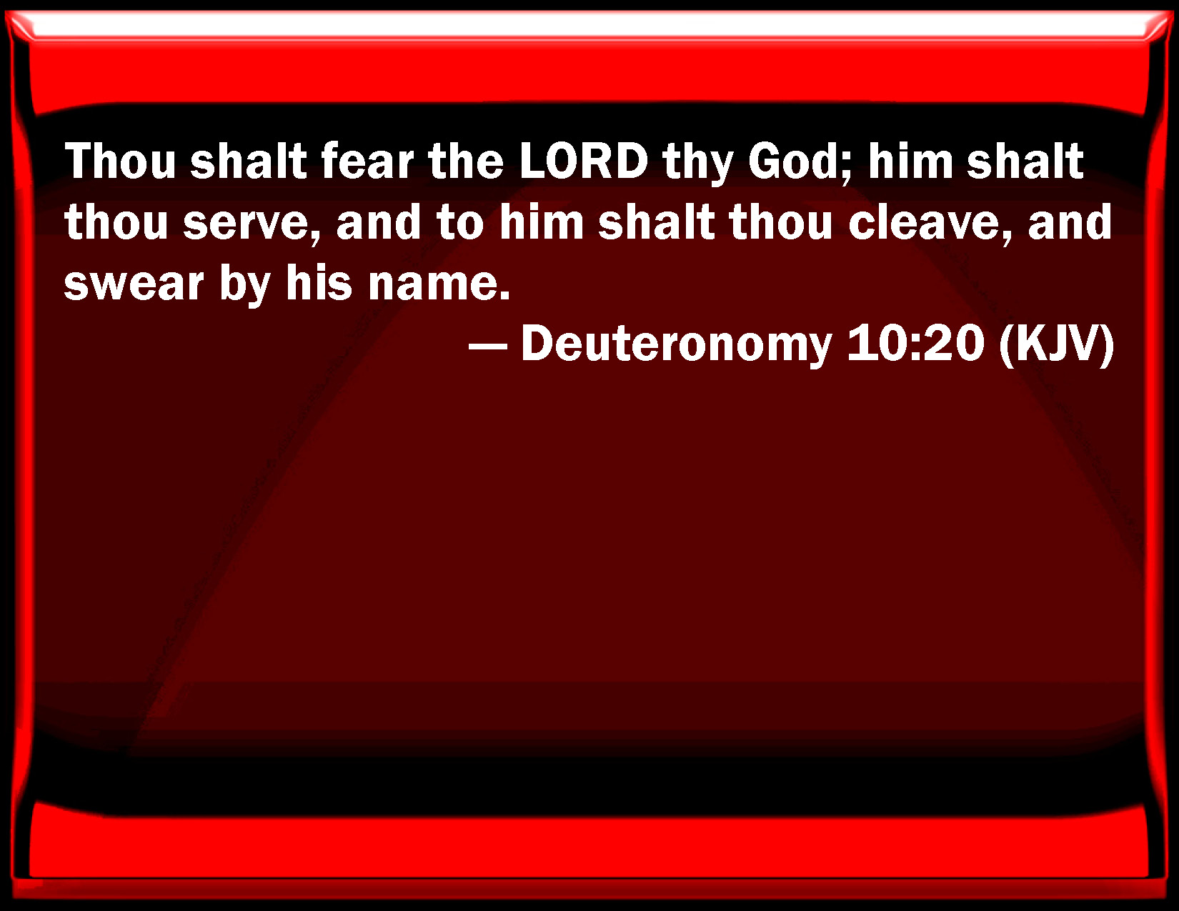 Bible Verse Slide Deuteronomy 10:20 You shall fear the LORD your God; him shall you serve, and to him shall you hold, and swear by his name. KJV: Thou shalt fear the LORD thy God; him shalt thou serve, and to him shalt thou cleave, and swear by his name. DRB: Thou shalt fear the Lord thy God, and serve him only: to him thou shalt adhere, and shalt swear by his name. DBT: Thou shalt fear Jehovah thy God; him thou shalt serve, and unto him shalt thou cleave, and swear by his name. ERV: Thou shalt fear the LORD thy God; him shalt thou serve; and to him shalt thou cleave, and by his name shalt thou swear. WBT: Thou shalt fear the LORD thy God; him shalt thou serve, and to him shalt thou cleave, and swear by his name. WEB: You shall fear Yahweh your God; you shall serve him; and you shall cling to him, and you shall swear by his name. YLT: 'Jehovah thy God thou dost fear, Him thou dost serve, and to Him thou dost cleave, and by His name thou dost swear.Links Deuteronomy 10:20 NIV • Deuteronomy 10:20 NLT • Deuteronomy 10:20 ESV • Deuteronomy 10:20 NASB • Deuteronomy 10:20 KJV • Deuteronomy 10:20 Interlinear • Deuteronomy 10:20 Commentaries • Deuteronomy 10:20 Parallel Texts • Deuteronomy 10:20 Bible Apps • Deuteronomy 10:20 Parallel • Bible Hub |