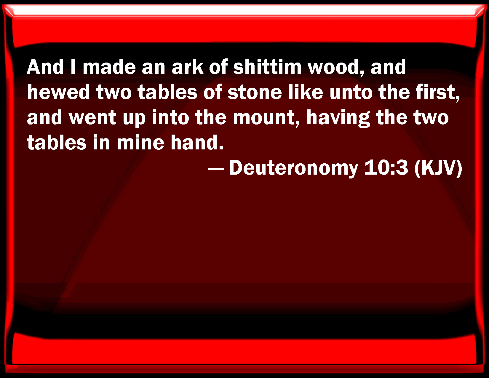Bible Verse Slide Deuteronomy 10:3 And I made an ark of shittim wood, and hewed two tables of stone like to the first, and went up into the mount, having the two tables in my hand. KJV: And I made an ark of shittim wood, and hewed two tables of stone like unto the first, and went up into the mount, having the two tables in mine hand. DRB: And I made an ark of setim wood And when I had hewn two tables of stone like the former, I went up into the mount, having them in my hands. DBT: And I made an ark of acacia-wood, and hewed two tables of stone like the first, and went up the mountain with the two tables in my hand. ERV: So I made an ark of acacia wood, and hewed two tables of stone like unto the first, and went up into the mount, having the two tables in mine hand. WBT: And I made an ark of shittim wood, and hewed two tables of stone like the first, and ascended the mount, having the two tables in my hand. WEB: So I made an ark of acacia wood, and cut two tables of stone like the first, and went up onto the mountain, having the two tables in my hand. YLT: and I make an ark of shittim wood, and grave two tables of stone like the first, and go up to the mount, and the two tables in my hand.Links Deuteronomy 10:3 NIV • Deuteronomy 10:3 NLT • Deuteronomy 10:3 ESV • Deuteronomy 10:3 NASB • Deuteronomy 10:3 KJV • Deuteronomy 10:3 Interlinear • Deuteronomy 10:3 Commentaries • Deuteronomy 10:3 Parallel Texts • Deuteronomy 10:3 Bible Apps • Deuteronomy 10:3 Parallel • Bible Hub |