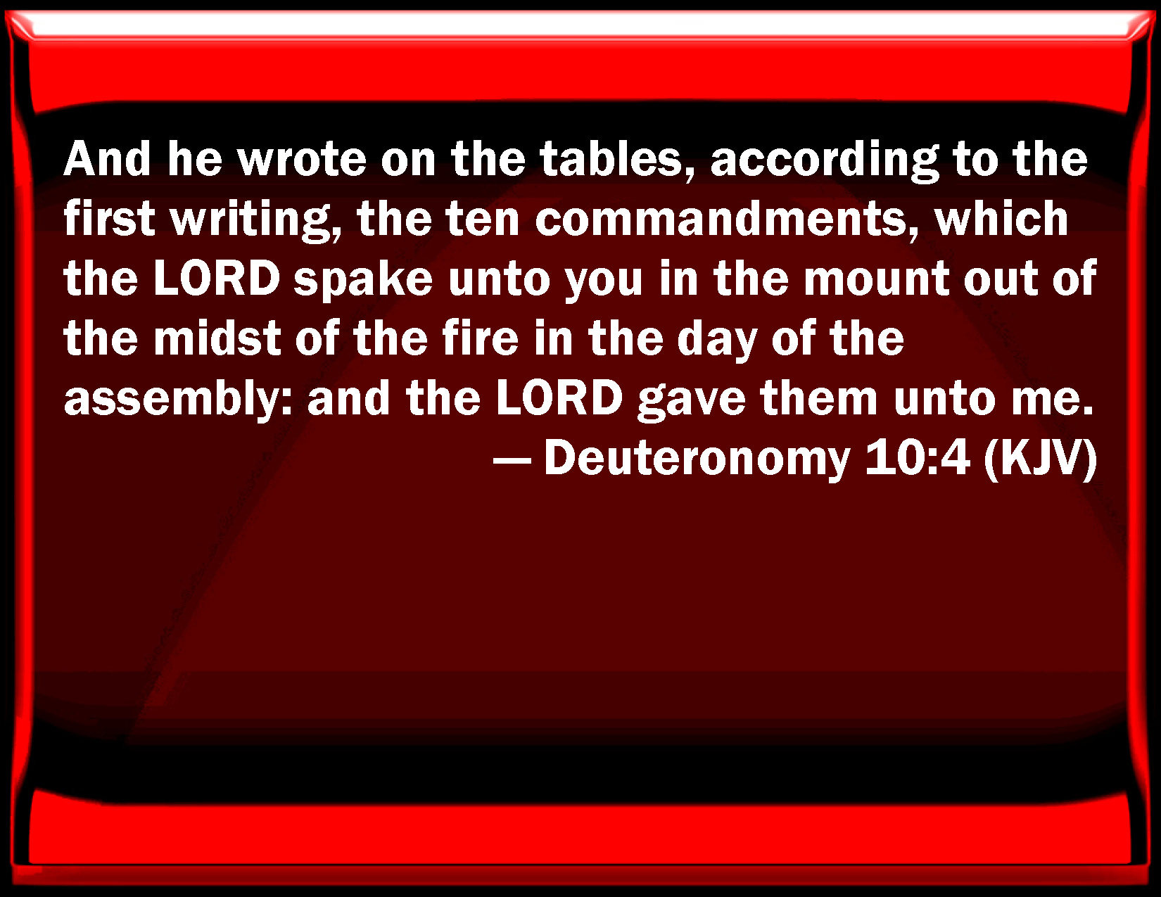 Bible Verse Slide Deuteronomy 10:4 And he wrote on the tables, according to the first writing, the ten commandments, which the LORD spoke to you in the mount out of the middle of the fire in the day of the assembly: and the LORD gave them to me. KJV: And he wrote on the tables, according to the first writing, the ten commandments, which the LORD spake unto you in the mount out of the midst of the fire in the day of the assembly: and the LORD gave them unto me. DRB: And he wrote in the tables, according as he had written before, the ten words, which the Lord spoke to you in the mount from the midst of the fire, when the people were assembled: and he gave them to me. DBT: And he wrote on the tables, as the first writing, the ten words which Jehovah spoke unto you on the mountain, from the midst of the fire, on the day of the assembly, and Jehovah gave them unto me. ERV: And he wrote on the tables, according to the first writing, the ten commandments, which the LORD spake unto you in the mount out of the midst of the fire in the day of the assembly: and the LORD gave them unto me. WBT: And he wrote on the tables according to the first writing, the ten commandments, which the LORD spoke to you in the mount, from the midst of the fire, in the day of the assembly: and the LORD gave them to me. WEB: He wrote on the tables, according to the first writing, the ten commandments, which Yahweh spoke to you on the mountain out of the midst of the fire in the day of the assembly: and Yahweh gave them to me. YLT: 'And He writeth on the tables, according to the first writing, the Ten Matters, which Jehovah hath spoken unto you in the mount, out of the midst of the fire, in the day of the assembly, and Jehovah giveth them unto me,Links Deuteronomy 10:4 NIV • Deuteronomy 10:4 NLT • Deuteronomy 10:4 ESV • Deuteronomy 10:4 NASB • Deuteronomy 10:4 KJV • Deuteronomy 10:4 Interlinear • Deuteronomy 10:4 Commentaries • Deuteronomy 10:4 Parallel Texts • Deuteronomy 10:4 Bible Apps • Deuteronomy 10:4 Parallel • Bible Hub |