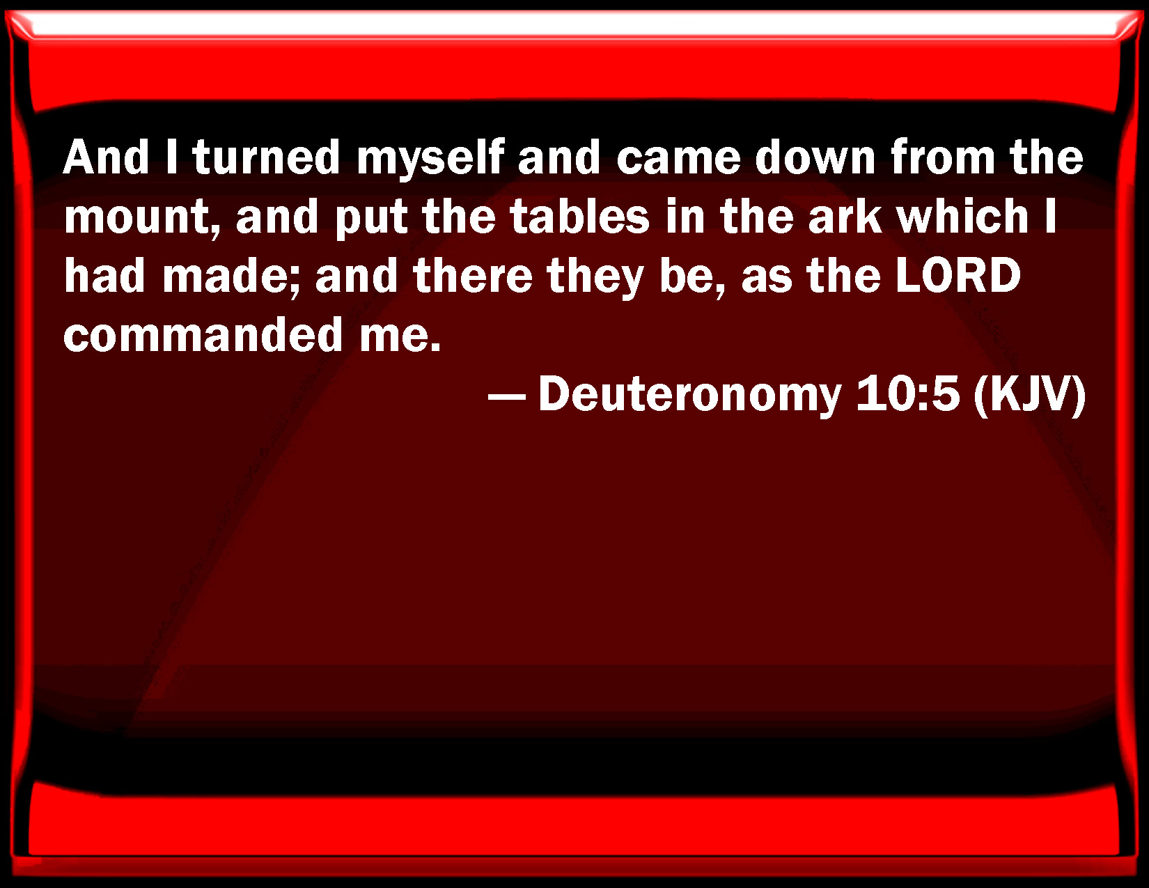 Bible Verse Slide Deuteronomy 10:5 And I turned myself and came down from the mount, and put the tables in the ark which I had made; and there they be, as the LORD commanded me. KJV: And I turned myself and came down from the mount, and put the tables in the ark which I had made; and there they be, as the LORD commanded me. DRB: And returning from the mount, I came down, and put the tables into the ark, that I had made, and they are there till this present, as the Lord commanded me. DBT: And I turned and came down from the mountain, and put the tables in the ark which I had made; and they are there, as Jehovah commanded me. ERV: And I turned and came down from the mount, and put the tables in the ark which I had made; and there they be, as the LORD commanded me. WBT: And I turned myself and came down from the mount, and put the tables in the ark which I had made; and there they are, as the LORD commanded me. WEB: I turned and came down from the mountain, and put the tables in the ark which I had made; and there they are as Yahweh commanded me. YLT: and I turn and come down from the mount, and put the tables in the ark which I had made, and they are there, as Jehovah commanded me.Links Deuteronomy 10:5 NIV • Deuteronomy 10:5 NLT • Deuteronomy 10:5 ESV • Deuteronomy 10:5 NASB • Deuteronomy 10:5 KJV • Deuteronomy 10:5 Interlinear • Deuteronomy 10:5 Commentaries • Deuteronomy 10:5 Parallel Texts • Deuteronomy 10:5 Bible Apps • Deuteronomy 10:5 Parallel • Bible Hub |