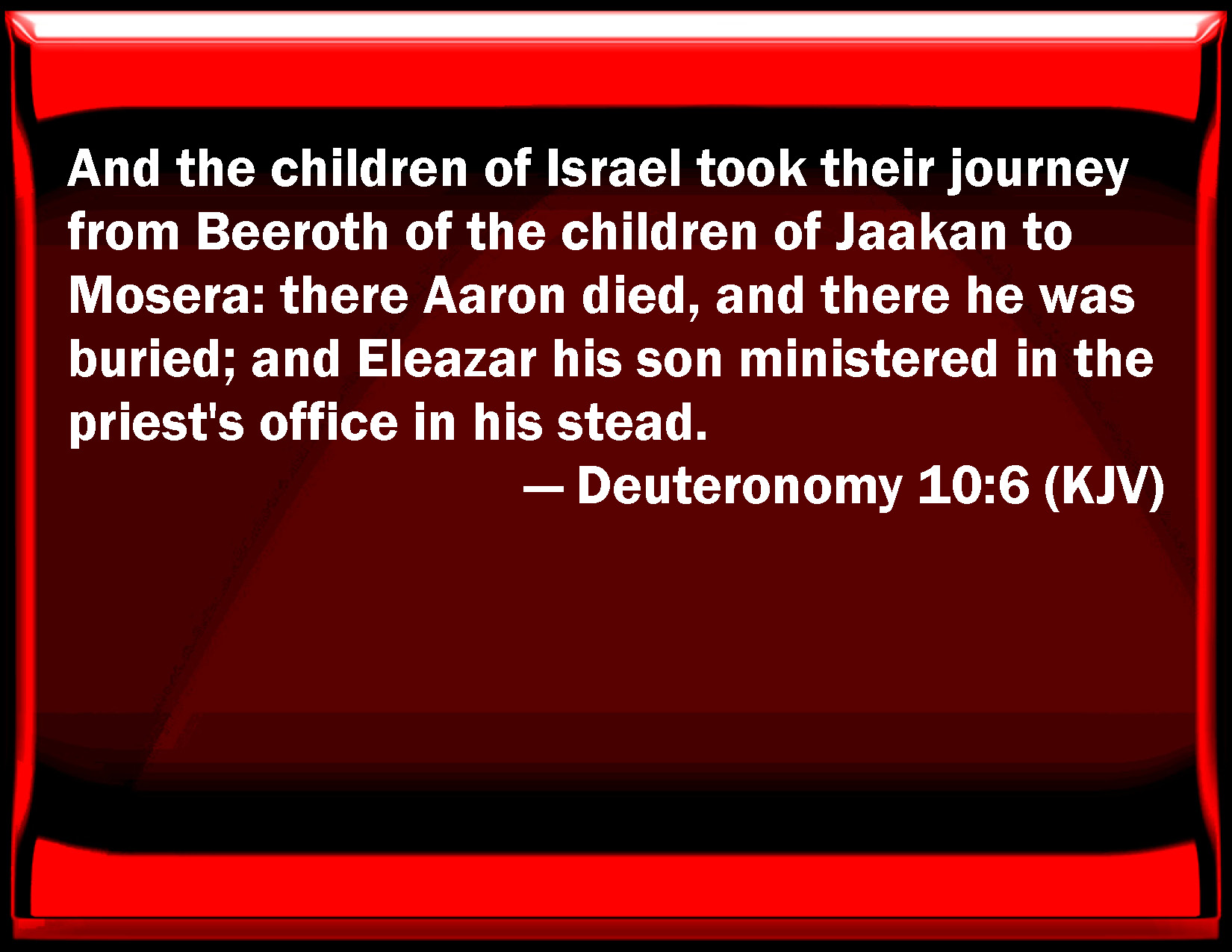 Bible Verse Slide Deuteronomy 10:6 And the children of Israel took their journey from Beeroth of the children of Jaakan to Mosera: there Aaron died, and there he was buried; and Eleazar his son ministered in the priest's office in his stead. KJV: And the children of Israel took their journey from Beeroth of the children of Jaakan to Mosera: there Aaron died, and there he was buried; and Eleazar his son ministered in the priest's office in his stead. DRB: And the children of Israel removed their camp from Beroth of the children of Jacan into Mosera, where Aaron died and was buried, and Eleazar his son succeeded him in the priestly office. DBT: (And the children of Israel took their journey from Beeroth-Bene-Jaakan to Moserah: there Aaron died, and there he was buried; and Eleazar his son exercised the priesthood in his stead. ERV: (And the children of Israel journeyed from Beeroth Bene-jaakan to Moserah: there Aaron died, and there he was buried; and Eleazar his son ministered in the priest's office in his stead. WBT: And the children of Israel took their journey from Beeroth of the children of Jakan to Mosira: there Aaron died, and there he was buried; and Eleazar his son ministered in the priest's office in his stead. WEB: (The children of Israel traveled from Beeroth Bene Jaakan to Moserah. There Aaron died, and there he was buried; and Eleazar his son ministered in the priest's office in his place. YLT: 'And the sons of Israel have journeyed from Beeroth of the sons of Jaakan to Mosera, there Aaron died, and he is buried there, and Eleazar his son doth act as priest in his stead;Links Deuteronomy 10:6 NIV • Deuteronomy 10:6 NLT • Deuteronomy 10:6 ESV • Deuteronomy 10:6 NASB • Deuteronomy 10:6 KJV • Deuteronomy 10:6 Interlinear • Deuteronomy 10:6 Commentaries • Deuteronomy 10:6 Parallel Texts • Deuteronomy 10:6 Bible Apps • Deuteronomy 10:6 Parallel • Bible Hub |
