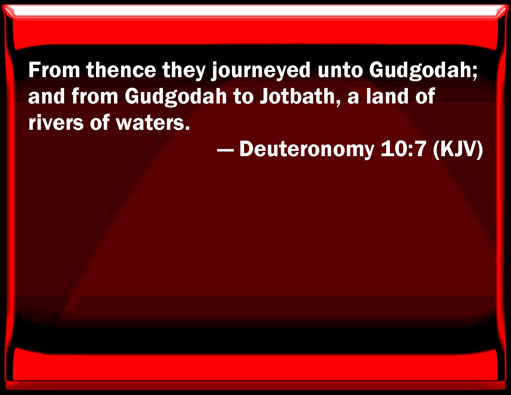 Bible Verse Slide Deuteronomy 10:7 From there they journeyed to Gudgodah; and from Gudgodah to Jotbath, a land of rivers of waters. KJV: From thence they journeyed unto Gudgodah; and from Gudgodah to Jotbath, a land of rivers of waters. DRB: From thence they came to Gadgad, from which place they departed, and camped in Jetebatha, in a land of waters and torrents. DBT: From thence they journeyed unto Gudgodah; and from Gudgodah to Jotbathah, a land of water-brooks.) ERV: From thence they journeyed unto Gudgodah; and from Gudgodah to Jotbathah, a land of brooks of water. WBT: From thence they journeyed to Gudgodah; and from Gudgodah to Jotbath, a land of rivers of waters. WEB: From there they traveled to Gudgodah; and from Gudgodah to Jotbathah, a land of brooks of water. YLT: thence they journeyed to Gudgodah, and from Gudgodah to Jotbathah, a land of brooks of water.Links Deuteronomy 10:7 NIV • Deuteronomy 10:7 NLT • Deuteronomy 10:7 ESV • Deuteronomy 10:7 NASB • Deuteronomy 10:7 KJV • Deuteronomy 10:7 Interlinear • Deuteronomy 10:7 Commentaries • Deuteronomy 10:7 Parallel Texts • Deuteronomy 10:7 Bible Apps • Deuteronomy 10:7 Parallel • Bible Hub |