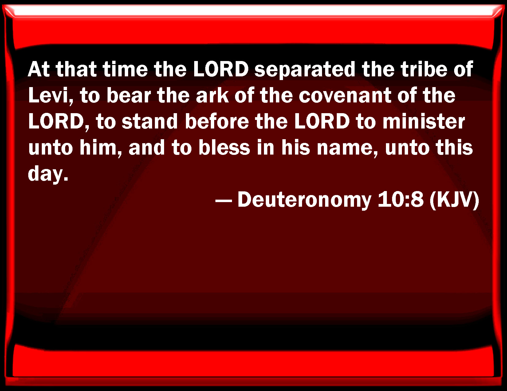 Bible Verse Slide Deuteronomy 10:8 At that time the LORD separated the tribe of Levi, to bear the ark of the covenant of the LORD, to stand before the LORD to minister to him, and to bless in his name, to this day. KJV: At that time the LORD separated the tribe of Levi, to bear the ark of the covenant of the LORD, to stand before the LORD to minister unto him, and to bless in his name, unto this day. DRB: At that time he separated the tribe of Levi, to carry the ark of the covenant of the Lord, and to stand before him in the ministry, and to bless in his name until this present day. DBT: At that time Jehovah separated the tribe of Levi, to bear the ark of the covenant of Jehovah, to stand before Jehovah to do service unto him, and to bless in his name, unto this day. ERV: At that time the LORD separated the tribe of Levi, to bear the ark of the covenant of the LORD, to stand before the LORD to minister unto him, and to bless in his name, unto this day. WBT: At that time the LORD separated the tribe of Levi, to bear the ark of the covenant of the LORD, to stand before the LORD to minister to him, and to bless in his name, to this day. WEB: At that time Yahweh set apart the tribe of Levi, to bear the ark of the covenant of Yahweh, to stand before Yahweh to minister to him, and to bless in his name, to this day. YLT: 'At that time hath Jehovah separated the tribe of Levi, to bear the ark of the covenant of Jehovah, to stand before Jehovah, to serve Him, and to bless in His name, unto this day,Links Deuteronomy 10:8 NIV • Deuteronomy 10:8 NLT • Deuteronomy 10:8 ESV • Deuteronomy 10:8 NASB • Deuteronomy 10:8 KJV • Deuteronomy 10:8 Interlinear • Deuteronomy 10:8 Commentaries • Deuteronomy 10:8 Parallel Texts • Deuteronomy 10:8 Bible Apps • Deuteronomy 10:8 Parallel • Bible Hub |