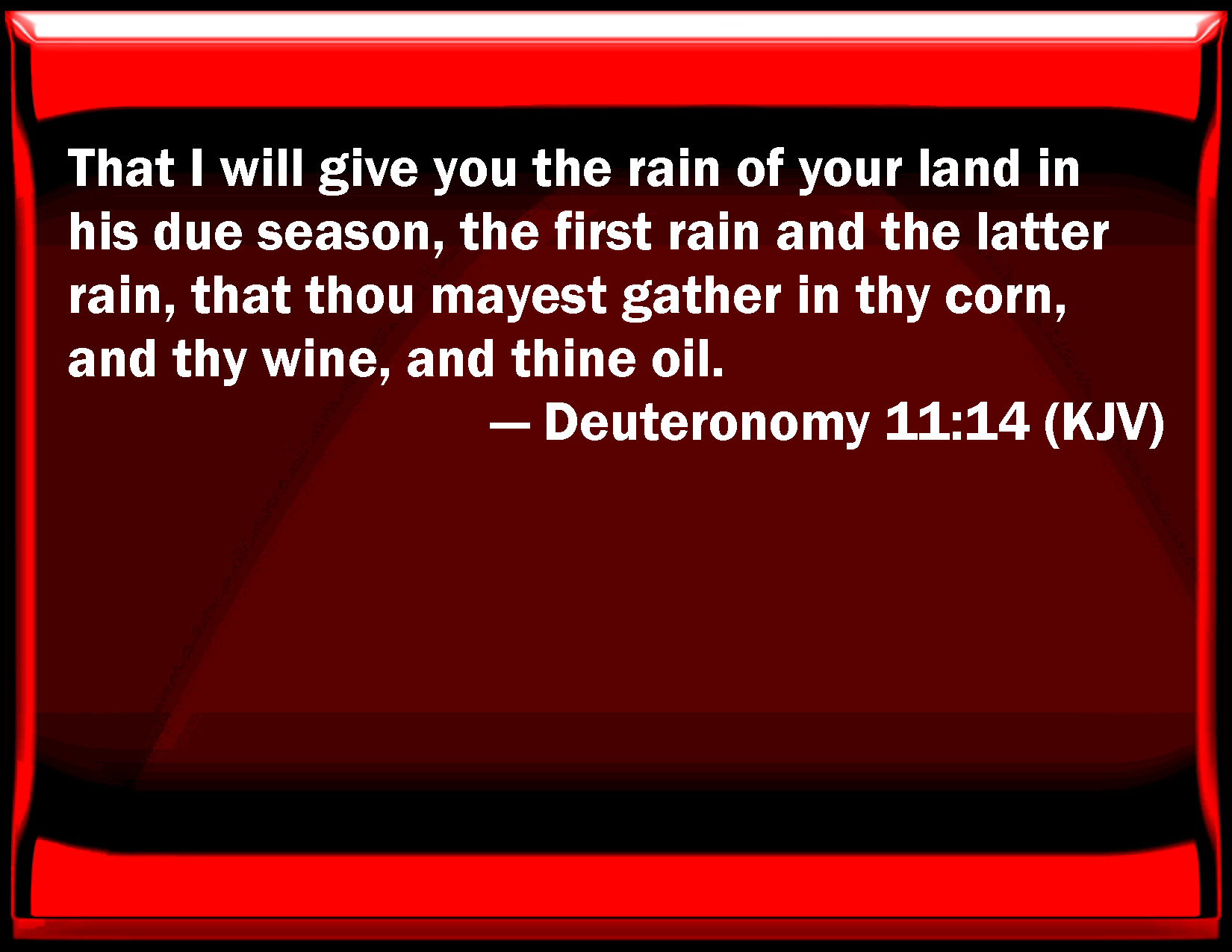 Bible Verse Slide Deuteronomy 11:14 That I will give you the rain of your land in his due season, the first rain and the latter rain, that you may gather in your corn, and your wine, and your oil. KJV: That I will give you the rain of your land in his due season, the first rain and the latter rain, that thou mayest gather in thy corn, and thy wine, and thine oil. DRB: He will give to your land the early rain and the latter rain, that you may gather in your corn, and your wine, and your oil, DBT: that I will give rain to your land in its season, the early rain and the latter rain; and thou shalt gather in thy corn, and thy new wine, and thine oil; ERV: that I will give the rain of your land in its season, the former rain and the latter rain, that thou mayest gather in thy corn, and thy wine, and thine oil. WBT: That I will give you the rain of your land in its due season, the former rain and the latter rain, that thou mayest gather in thy corn, and thy wine and thy oil. WEB: that I will give the rain of your land in its season, the former rain and the latter rain, that you may gather in your grain, and your new wine, and your oil. YLT: that I have given the rain of your land in its season — sprinkling and gathered — and thou hast gathered thy corn, and thy new wine, and thine oil,Links Deuteronomy 11:14 NIV • Deuteronomy 11:14 NLT • Deuteronomy 11:14 ESV • Deuteronomy 11:14 NASB • Deuteronomy 11:14 KJV • Deuteronomy 11:14 Interlinear • Deuteronomy 11:14 Commentaries • Deuteronomy 11:14 Parallel Texts • Deuteronomy 11:14 Bible Apps • Deuteronomy 11:14 Parallel • Bible Hub |