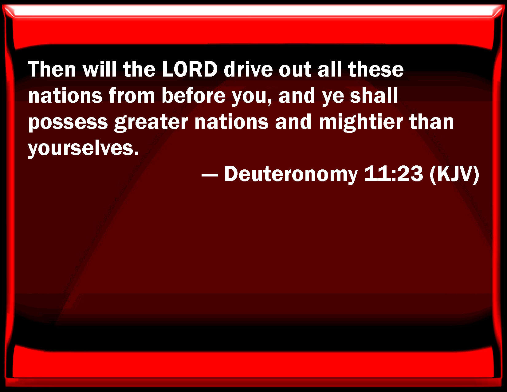 Bible Verse Slide Deuteronomy 11:23 Then will the LORD drive out all these nations from before you, and you shall possess greater nations and mightier than yourselves. KJV: Then will the LORD drive out all these nations from before you, and ye shall possess greater nations and mightier than yourselves. DRB: The Lord will destroy all these nations before your face, and you shall possess them, which are greater and stronger than you. DBT: then will Jehovah dispossess all these nations from before you, and ye shall take possession of nations greater and mightier than yourselves. ERV: then will the LORD drive out all these nations from before you, and ye shall possess nations greater and mightier than yourselves. WBT: Then will the LORD drive out all these nations from before you, and ye shall possess greater nations and mightier than yourselves. WEB: then will Yahweh drive out all these nations from before you, and you shall dispossess nations greater and mightier than yourselves. YLT: then hath Jehovah dispossessed all these nations from before you, and ye have possessed nations, greater and mightier than you;Links Deuteronomy 11:23 NIV • Deuteronomy 11:23 NLT • Deuteronomy 11:23 ESV • Deuteronomy 11:23 NASB • Deuteronomy 11:23 KJV • Deuteronomy 11:23 Interlinear • Deuteronomy 11:23 Commentaries • Deuteronomy 11:23 Parallel Texts • Deuteronomy 11:23 Bible Apps • Deuteronomy 11:23 Parallel • Bible Hub |
