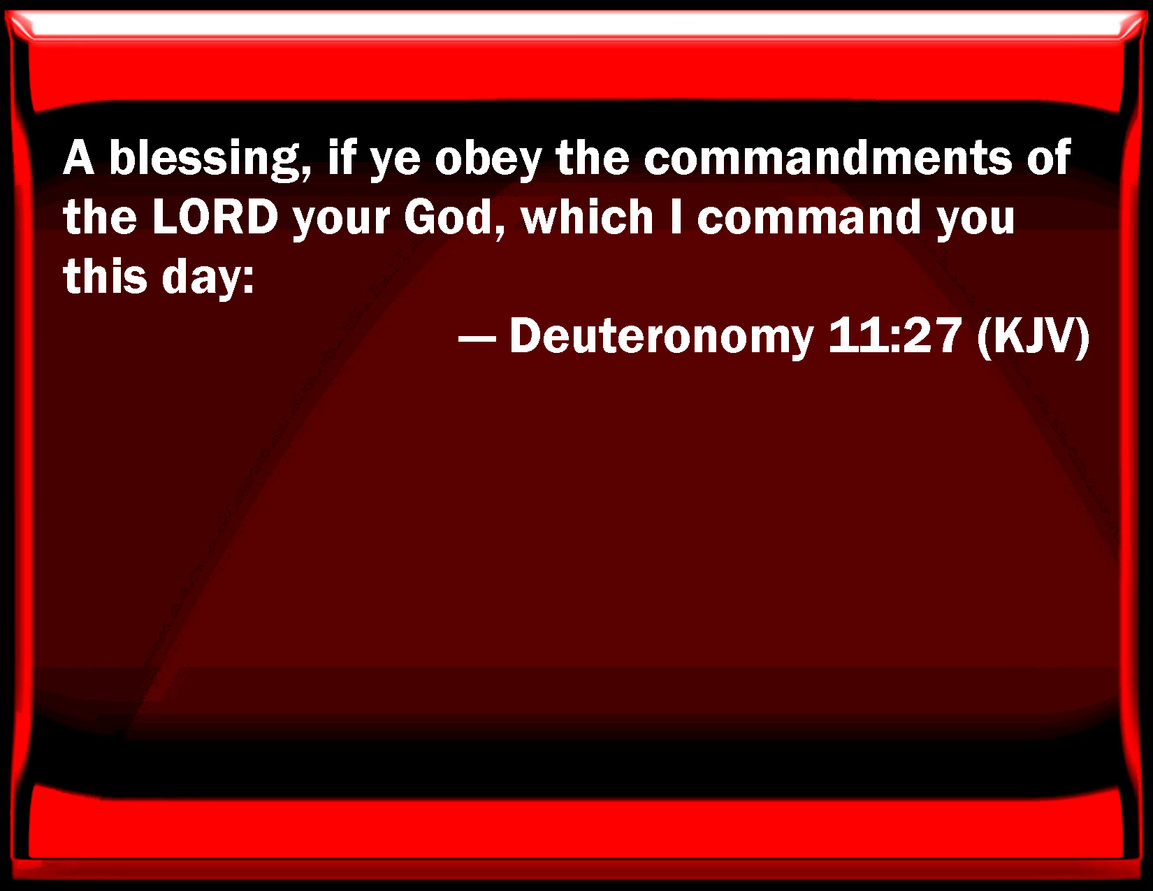 Bible Verse Slide Deuteronomy 11:27 A blessing, if you obey the commandments of the LORD your God, which I command you this day: KJV: A blessing, if ye obey the commandments of the LORD your God, which I command you this day: DRB: A blessing, if you obey the commandments of the Lord your God, which I command you this day: DBT: a blessing, if ye obey the commandments of Jehovah your God, which I command you this day; ERV: the blessing, if ye shall hearken unto the commandments of the LORD your God, which I command you this day: WBT: A blessing, if ye obey the commandments of the LORD your God which I command you this day; WEB: the blessing, if you shall listen to the commandments of Yahweh your God, which I command you this day; YLT: the blessing, when ye hearken unto the commands of Jehovah your God, which I am commanding you to-day;Links Deuteronomy 11:27 NIV • Deuteronomy 11:27 NLT • Deuteronomy 11:27 ESV • Deuteronomy 11:27 NASB • Deuteronomy 11:27 KJV • Deuteronomy 11:27 Interlinear • Deuteronomy 11:27 Commentaries • Deuteronomy 11:27 Parallel Texts • Deuteronomy 11:27 Bible Apps • Deuteronomy 11:27 Parallel • Bible Hub |