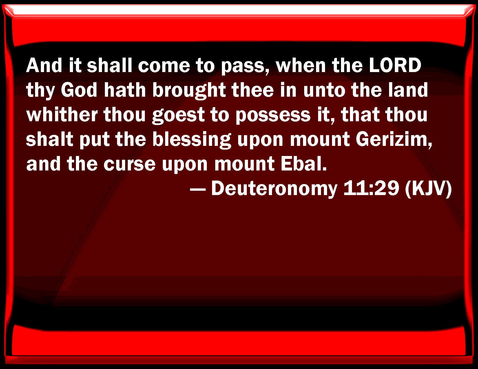 Bible Verse Slide Deuteronomy 11:29 And it shall come to pass, when the LORD your God has brought you in to the land where you go to possess it, that you shall put the blessing on mount Gerizim, and the curse on mount Ebal. KJV: And it shall come to pass, when the LORD thy God hath brought thee in unto the land whither thou goest to possess it, that thou shalt put the blessing upon mount Gerizim, and the curse upon mount Ebal. DRB: And when the Lord thy God shall have brought thee into the land, whither thou goest to dwell, thou shalt put the blessing upon mount Garizim, the curse upon mount Hebal: DBT: And it shall come to pass, when Jehovah thy God hath brought thee into the land whither thou enterest in to possess it, that thou shalt put the blessing upon mount Gerizim, and the curse upon mount Ebal. ERV: And it shall come to pass, when the LORD thy God shall bring thee into the land whither thou goest to possess it, that thou shalt set the blessing upon mount Gerizim, and the curse upon mount Ebal. WBT: And it shall come to pass when the LORD thy God hath brought thee in to the land whither thou goest to possess it, that thou shalt put the blessing upon mount Gerizim, and the curse upon mount Ebal. WEB: It shall happen, when Yahweh your God shall bring you into the land where you go to possess it, that you shall set the blessing on Mount Gerizim, and the curse on Mount Ebal. YLT: 'And it hath been, when Jehovah thy God doth bring thee in unto the land whither thou art going in to possess it, that thou hast given the blessing on mount Gerizim, and the reviling on mount Ebal;Links Deuteronomy 11:29 NIV • Deuteronomy 11:29 NLT • Deuteronomy 11:29 ESV • Deuteronomy 11:29 NASB • Deuteronomy 11:29 KJV • Deuteronomy 11:29 Interlinear • Deuteronomy 11:29 Commentaries • Deuteronomy 11:29 Parallel Texts • Deuteronomy 11:29 Bible Apps • Deuteronomy 11:29 Parallel • Bible Hub |