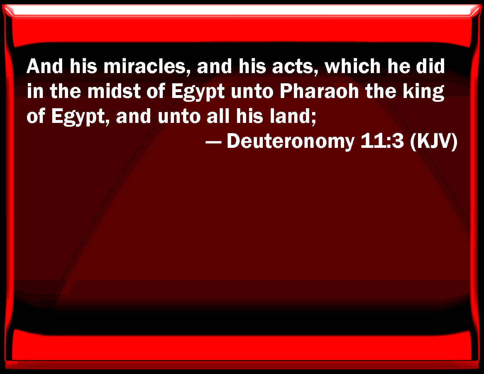 Bible Verse Slide Deuteronomy 11:3 And his miracles, and his acts, which he did in the middle of Egypt to Pharaoh the king of Egypt, and to all his land; KJV: And his miracles, and his acts, which he did in the midst of Egypt unto Pharaoh the king of Egypt, and unto all his land; DRB: The signs and works which he did in the midst of Egypt to king Pharao, and to all his land, DBT: and his signs and his acts which he did in the midst of Egypt unto Pharaoh the king of Egypt, and unto all his land; ERV: and his signs, and his works, which he did in the midst of Egypt unto Pharaoh the king of Egypt, and unto all his land; WBT: And his miracles, and his acts, which he did in the midst of Egypt, to Pharaoh the king of Egypt, and to all his land; WEB: and his signs, and his works, which he did in the midst of Egypt to Pharaoh the king of Egypt, and to all his land; YLT: and His signs, and His doings, which He hath done in the midst of Egypt, to Pharaoh king of Egypt, and to all his land;Links Deuteronomy 11:3 NIV • Deuteronomy 11:3 NLT • Deuteronomy 11:3 ESV • Deuteronomy 11:3 NASB • Deuteronomy 11:3 KJV • Deuteronomy 11:3 Interlinear • Deuteronomy 11:3 Commentaries • Deuteronomy 11:3 Parallel Texts • Deuteronomy 11:3 Bible Apps • Deuteronomy 11:3 Parallel • Bible Hub |