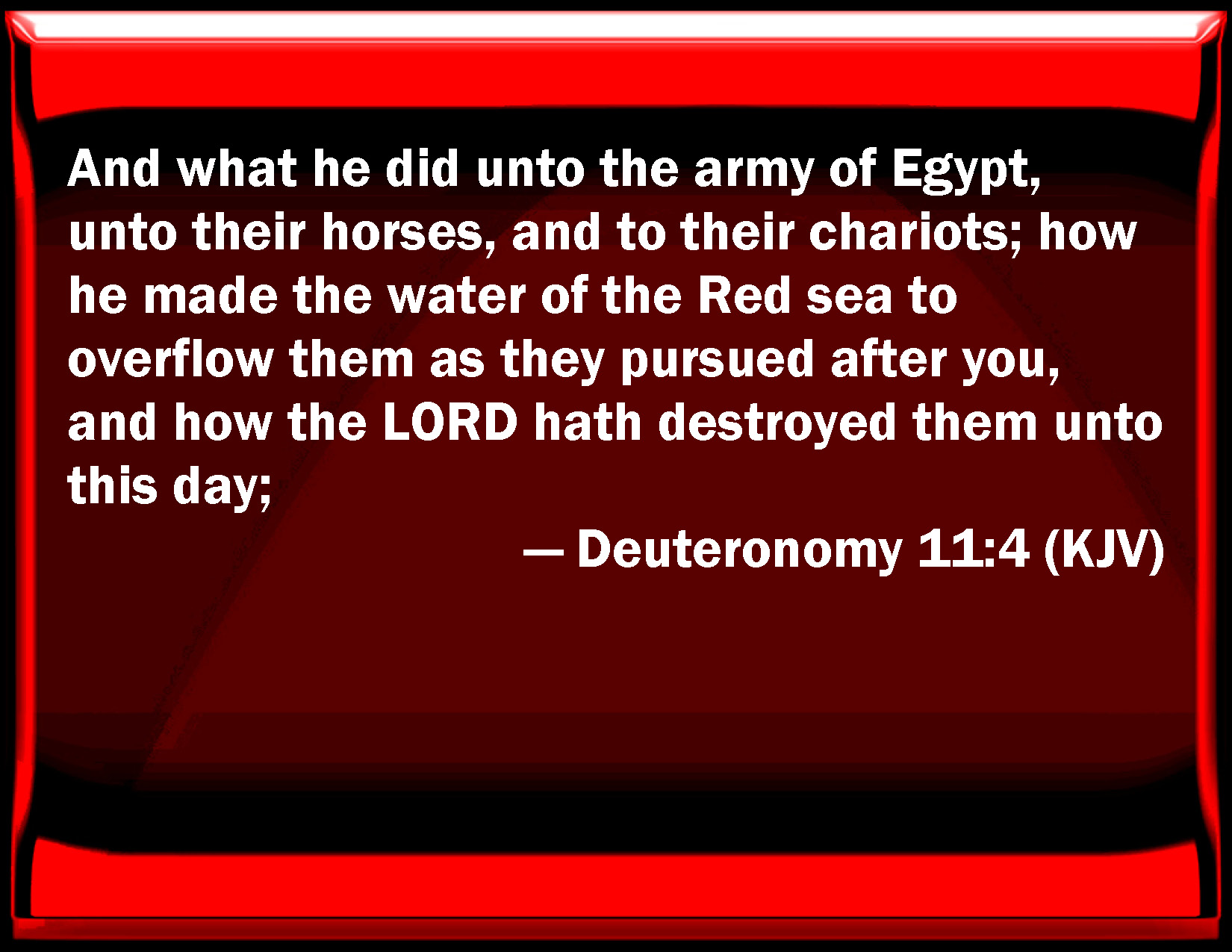 Bible Verse Slide Deuteronomy 11:4 And what he did to the army of Egypt, to their horses, and to their chariots; how he made the water of the Red sea to overflow them as they pursued after you, and how the LORD has destroyed them to this day; KJV: And what he did unto the army of Egypt, unto their horses, and to their chariots; how he made the water of the Red sea to overflow them as they pursued after you, and how the LORD hath destroyed them unto this day; DRB: And to all the host of the Egyptians, and to their horses and chariots: how the waters of the Red Sea covered them, when they pursued you, and how the Lord destroyed them until this present day: DBT: and what he did unto the army of Egypt, unto their horses, and unto their chariots, over which he made the water of the Red sea flow as they pursued after you, and Jehovah destroyed them unto this day; ERV: and what he did unto the army of Egypt, unto their horses, and to their chariots; how he made the water of the Red Sea to overflow them as they pursued after you, and how the LORD hath destroyed them unto this day; WBT: And what he did to the army of Egypt, to their horses, and to their chariots; how he made the water of the Red sea to overflow them as they pursued after you, and how the LORD hath destroyed them to this day; WEB: and what he did to the army of Egypt, to their horses, and to their chariots; how he made the water of the Red Sea to overflow them as they pursued after you, and how Yahweh has destroyed them to this day; YLT: and that which He hath done to the force of Egypt, to its horses, and to its chariot, when He hath caused the waters of the Red Sea to flow against their faces in their pursuing after them, and Jehovah destroyeth them, unto this day;Links Deuteronomy 11:4 NIV • Deuteronomy 11:4 NLT • Deuteronomy 11:4 ESV • Deuteronomy 11:4 NASB • Deuteronomy 11:4 KJV • Deuteronomy 11:4 Interlinear • Deuteronomy 11:4 Commentaries • Deuteronomy 11:4 Parallel Texts • Deuteronomy 11:4 Bible Apps • Deuteronomy 11:4 Parallel • Bible Hub |
