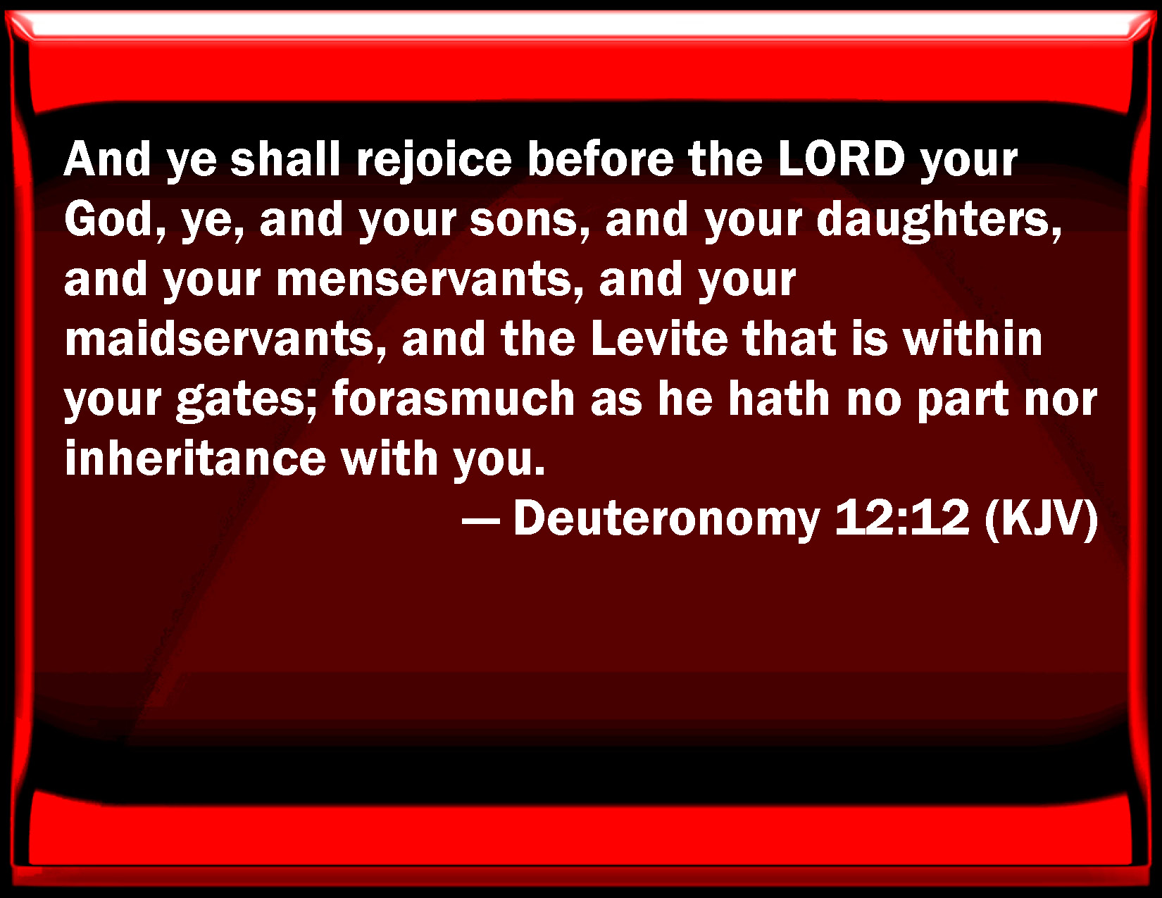 Bible Verse Slide Deuteronomy 12:12 And you shall rejoice before the LORD your God, you, and your sons, and your daughters, and your menservants, and your maidservants, and the Levite that is within your gates; for as much as he has no part nor inheritance with you. KJV: And ye shall rejoice before the LORD your God, ye, and your sons, and your daughters, and your menservants, and your maidservants, and the Levite that is within your gates; forasmuch as he hath no part nor inheritance with you. DRB: There shall you feast before the Lord your God, you and your sons and your daughters, your menservants and maid- servants, and the Levite that dwelleth in your cities. For he hath no other part and possession among you. DBT: And ye shall rejoice before Jehovah your God, ye, and your sons, and your daughters, and your bondmen, and your handmaids, and the Levite that is within your gates; for he hath no portion nor inheritance with you. ERV: and ye shall rejoice before the LORD your God, ye, and your sons, and your daughters, and your menservants, and your maidservants, and the Levite that is within your gates, forasmuch as he hath no portion nor inheritance with you. WBT: And ye shall rejoice before the LORD your God, ye, and your sons, and your daughters, and your men-servants, and your maid-servants, and the Levite that is within your gates; forasmuch as he hath no part nor inheritance with you. WEB: You shall rejoice before Yahweh your God, you, and your sons, and your daughters, and your male servants, and your female servants, and the Levite who is within your gates, because he has no portion nor inheritance with you. YLT: and ye have rejoiced before Jehovah your God, ye, and your sons, and your daughters, and your men-servants, and your handmaids, and the Levite who is within your gates, for he hath no part and inheritance with you.Links Deuteronomy 12:12 NIV • Deuteronomy 12:12 NLT • Deuteronomy 12:12 ESV • Deuteronomy 12:12 NASB • Deuteronomy 12:12 KJV • Deuteronomy 12:12 Interlinear • Deuteronomy 12:12 Commentaries • Deuteronomy 12:12 Parallel Texts • Deuteronomy 12:12 Bible Apps • Deuteronomy 12:12 Parallel • Bible Hub |