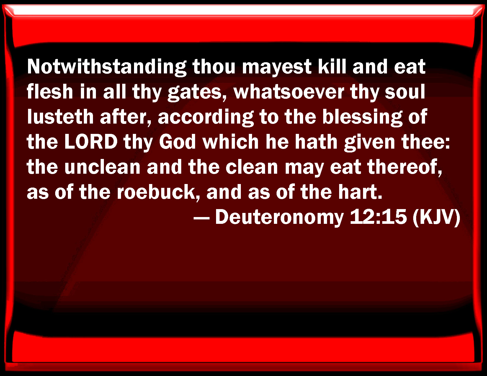 Bible Verse Slide Deuteronomy 12:15 Notwithstanding you may kill and eat flesh in all your gates, whatever your soul lusts after, according to the blessing of the LORD your God which he has given you: the unclean and the clean may eat thereof, as of the roebuck, and as of the hart. KJV: Notwithstanding thou mayest kill and eat flesh in all thy gates, whatsoever thy soul lusteth after, according to the blessing of the LORD thy God which he hath given thee: the unclean and the clean may eat thereof, as of the roebuck, and as of the hart. DRB: But if thou desirest to eat, and the eating of flesh delight thee, kill, and eat according to the blessing of the Lord thy God, which he hath given thee, in thy cities: whether it be unclean, that is to say, having blemish or defect: or clean, that is to say, sound and without blemish, such as may be offered, as the roe, and the hart, shalt thou eat it: DBT: Nevertheless, according to all the desire of thy soul thou mayest slay and eat flesh in all thy gates, according to the blessing of Jehovah thy God which he hath given thee: the unclean and the clean may eat thereof, as of the gazelle, and the hart. ERV: Notwithstanding thou mayest kill and eat flesh within all thy gates, after all the desire of thy soul, according to the blessing of the LORD thy God which he hath given thee: the unclean and the clean may eat thereof, as of the gazelle, and as of the hart. WBT: Notwithstanding, thou mayest kill and eat flesh in all thy gates, whatever thy soul desireth, according to the blessing of the LORD thy God which he hath given thee: the unclean and the clean may eat of it as of the roebuck, and as of the hart. WEB: Notwithstanding, you may kill and eat flesh within all your gates, after all the desire of your soul, according to the blessing of Yahweh your God which he has given you: the unclean and the clean may eat of it, as of the gazelle, and as of the hart. YLT: 'Only, with all the desire of thy soul thou dost sacrifice, and hast eaten flesh according to the blessing of Jehovah thy God which He hath given to thee, in all thy gates; the unclean and the clean do eat it, as of the roe, and as of the hart.Links Deuteronomy 12:15 NIV • Deuteronomy 12:15 NLT • Deuteronomy 12:15 ESV • Deuteronomy 12:15 NASB • Deuteronomy 12:15 KJV • Deuteronomy 12:15 Interlinear • Deuteronomy 12:15 Commentaries • Deuteronomy 12:15 Parallel Texts • Deuteronomy 12:15 Bible Apps • Deuteronomy 12:15 Parallel • Bible Hub |