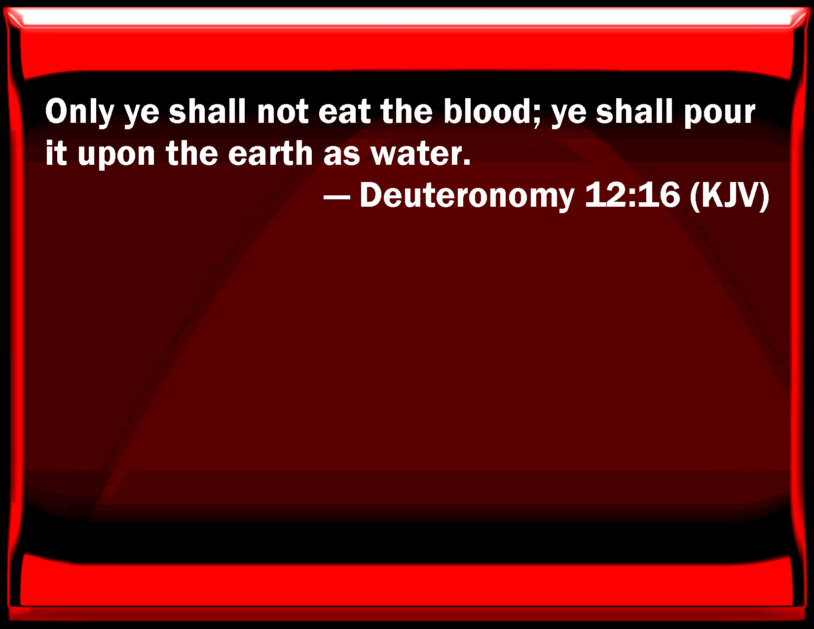 Deuteronomy 12:16 Only you shall not eat the blood; you shall pour it on the earth as water.