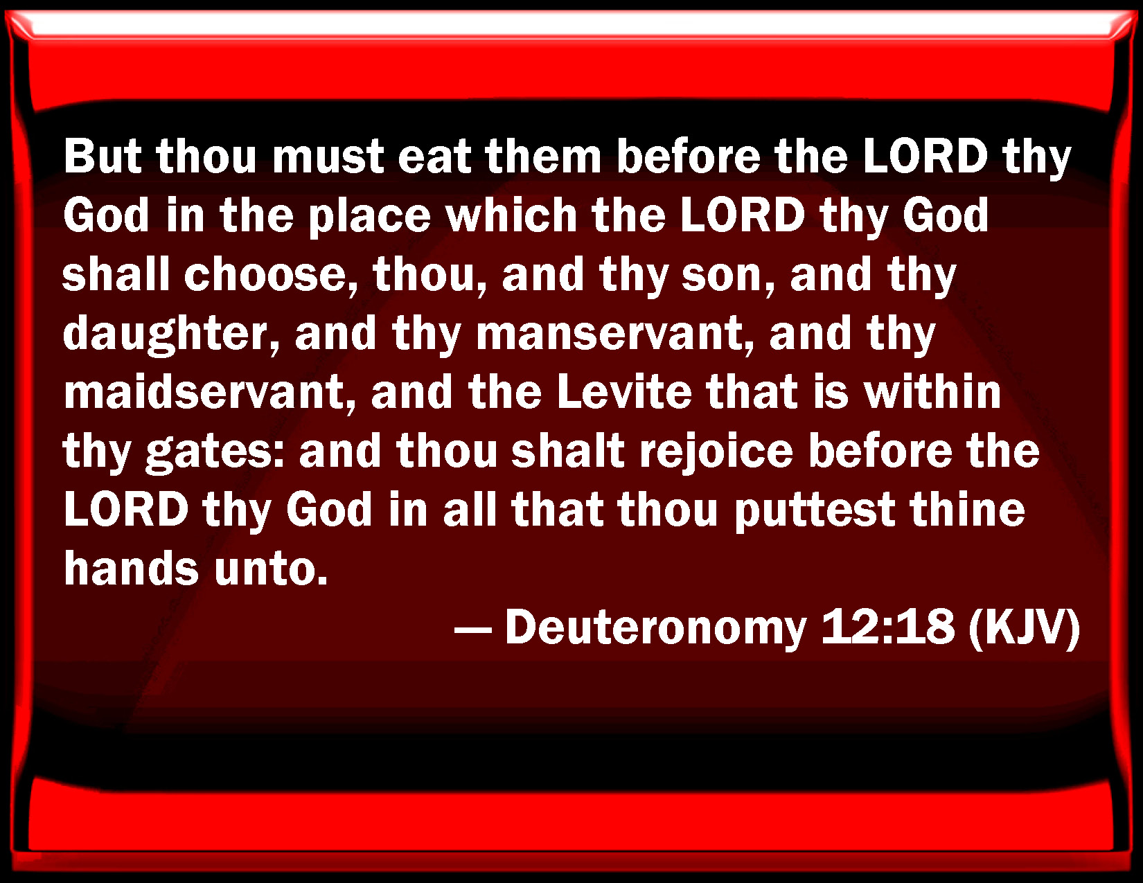 Bible Verse Slide Deuteronomy 12:18 But you must eat them before the LORD your God in the place which the LORD your God shall choose, you, and your son, and your daughter, and your manservant, and your maidservant, and the Levite that is within your gates: and you shall rejoice before the LORD your God in all that you put your hands to. KJV: But thou must eat them before the LORD thy God in the place which the LORD thy God shall choose, thou, and thy son, and thy daughter, and thy manservant, and thy maidservant, and the Levite that is within thy gates: and thou shalt rejoice before the LORD thy God in all that thou puttest thine hands unto. DRB: But thou shalt eat them before the Lord thy God in the place which the Lord thy God shall choose, thou and thy son and thy daughter, and thy manservant, and maidservant, and the Levite that dwelleth in thy cities: and thou shalt rejoice and be refreshed before the Lord thy God in all things, whereunto thou shalt put thy hand. DBT: but before Jehovah thy God shalt thou eat them in the place which Jehovah thy God will choose, thou and thy son, and thy daughter, and thy bondman, and thy handmaid, and the Levite that is within thy gates; and thou shalt rejoice before Jehovah thy God in all the business of thy hand. ERV: but thou shalt eat them before the LORD thy God in the place which the LORD thy God shall choose, thou, and thy son, and thy daughter, and thy manservant, and thy maidservant, and the Levite that is within thy gates: and thou shalt rejoice before the LORD thy God in all that thou puttest thine hand unto. WBT: But thou must eat them before the LORD thy God in the place which the LORD thy God shall choose, thou, and thy son, and thy daughter, and thy man-servant, and thy maid-servant, and the Levite that is within thy gates: and thou shalt rejoice before the LORD thy God in all that thou puttest thine hands to. WEB: but you shall eat them before Yahweh your God in the place which Yahweh your God shall choose, you, and your son, and your daughter, and your male servant, and your female servant, and the Levite who is within your gates: and you shall rejoice before Yahweh your God in all that you put your hand to. YLT: but before Jehovah thy God thou dost eat it, in the place which Jehovah thy God doth fix on, thou, and thy son, and thy daughter, and thy man-servant, and thy handmaid, and the Levite who is within thy gates, and thou hast rejoiced before Jehovah thy God in every putting forth of thy hand;Links Deuteronomy 12:18 NIV • Deuteronomy 12:18 NLT • Deuteronomy 12:18 ESV • Deuteronomy 12:18 NASB • Deuteronomy 12:18 KJV • Deuteronomy 12:18 Interlinear • Deuteronomy 12:18 Commentaries • Deuteronomy 12:18 Parallel Texts • Deuteronomy 12:18 Bible Apps • Deuteronomy 12:18 Parallel • Bible Hub |