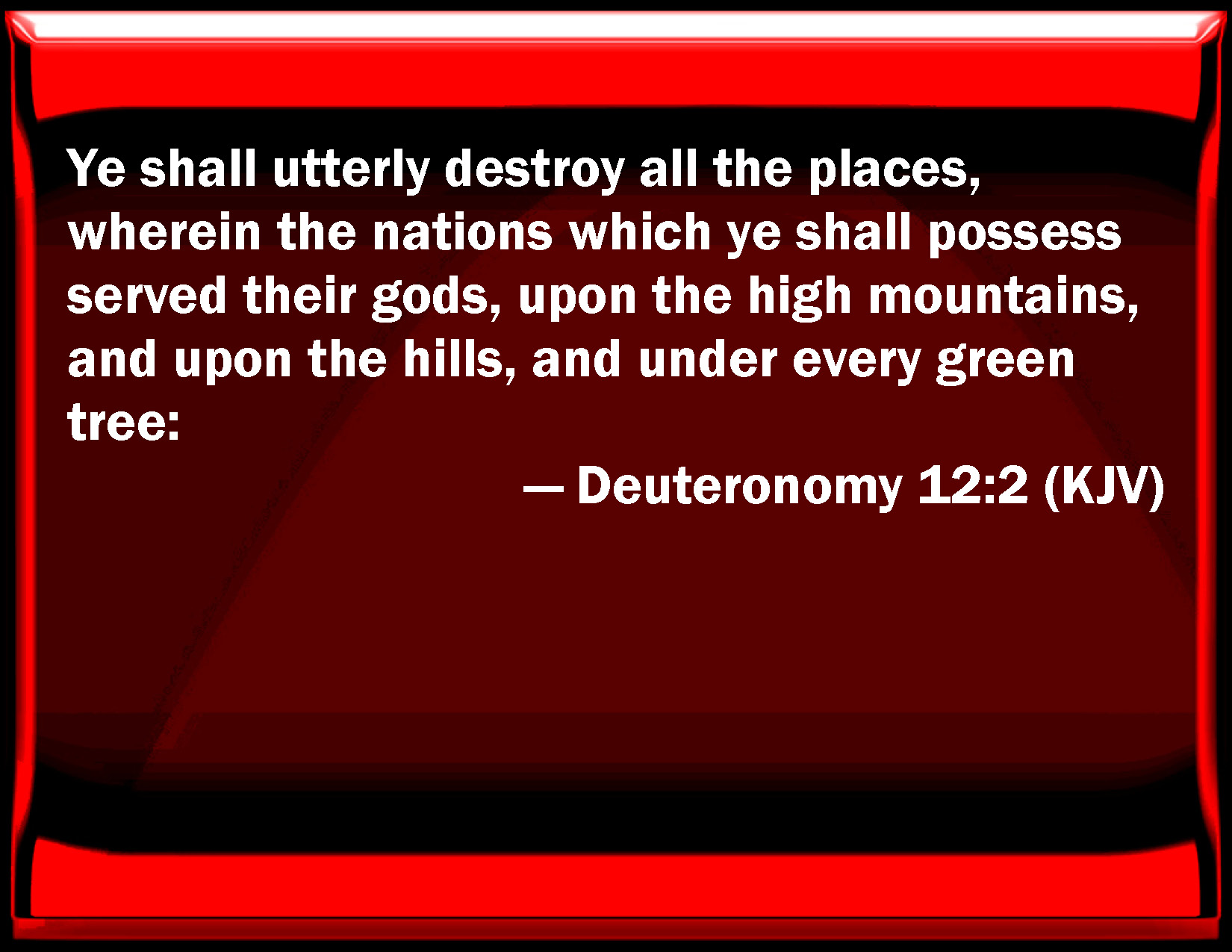 Bible Verse Slide Deuteronomy 12:2 You shall utterly destroy all the places, wherein the nations which you shall possess served their gods, on the high mountains, and on the hills, and under every green tree: KJV: Ye shall utterly destroy all the places, wherein the nations which ye shall possess served their gods, upon the high mountains, and upon the hills, and under every green tree: DRB: Destroy all the places in which the nations, that you shall possess, worshipped their gods upon high mountains, and hills, and under every shady tree: DBT: Ye shall utterly destroy all the places wherein the nations which ye shall dispossess have served their gods, upon the high mountains, and upon the hills, and under every green tree; ERV: Ye shall surely destroy all the places, wherein the nations which ye shall possess served their gods, upon the high mountains, and upon the hills, and under every green tree: WBT: Ye shall utterly destroy all the places in which the nations which ye shall possess served their gods, upon the high mountains, and upon the hills, and under every green tree: WEB: You shall surely destroy all the places in which the nations that you shall dispossess served their gods, on the high mountains, and on the hills, and under every green tree: YLT: ye do utterly destroy all the places where the nations which ye are dispossessing served their gods, on the high mountains, and on the heights, and under every green tree;Links Deuteronomy 12:2 NIV • Deuteronomy 12:2 NLT • Deuteronomy 12:2 ESV • Deuteronomy 12:2 NASB • Deuteronomy 12:2 KJV • Deuteronomy 12:2 Interlinear • Deuteronomy 12:2 Commentaries • Deuteronomy 12:2 Parallel Texts • Deuteronomy 12:2 Bible Apps • Deuteronomy 12:2 Parallel • Bible Hub |