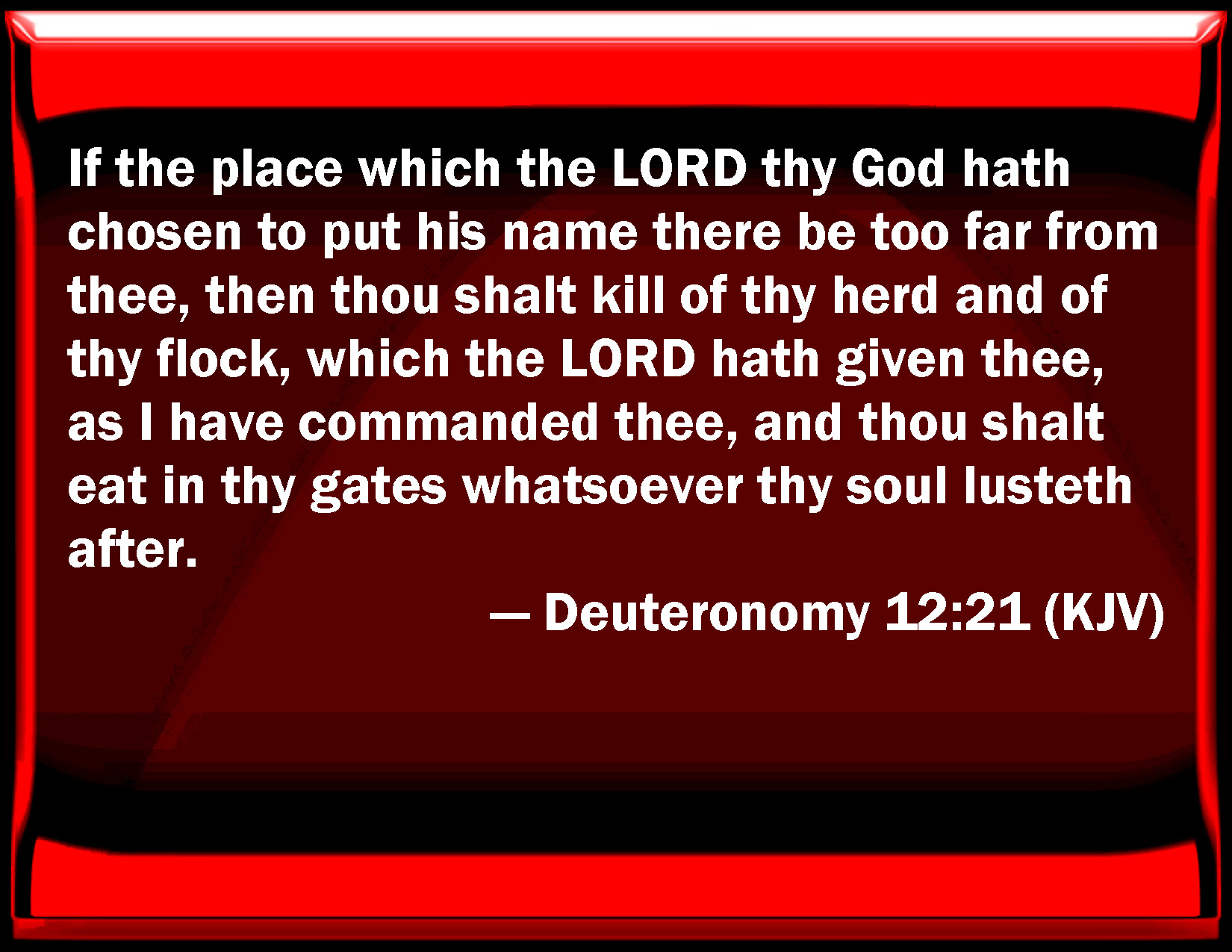 Bible Verse Slide Deuteronomy 12:21 If the place which the LORD your God has chosen to put his name there be too far from you, then you shall kill of your herd and of your flock, which the LORD has given you, as I have commanded you, and you shall eat in your gates whatever your soul lusts after. KJV: If the place which the LORD thy God hath chosen to put his name there be too far from thee, then thou shalt kill of thy herd and of thy flock, which the LORD hath given thee, as I have commanded thee, and thou shalt eat in thy gates whatsoever thy soul lusteth after. DRB: And if the place which the Lord thy God shall choose, that his name should be there, be far off, thou shalt kill of thy herds and of thy docks, as I have commanded thee, and shalt eat in thy towns, as it pleaseth thee. DBT: If the place which Jehovah thy God will choose to set his name there be too far from thee, then thou shalt slay of thy kine and of thy sheep which Jehovah hath given thee, as I have commanded thee, and thou shalt eat in thy gates according to all the desire of thy soul. ERV: If the place which the LORD thy God shall choose to put his name there be too far from thee, then thou shalt kill of thy herd and of thy flock, which the LORD hath given thee, as I have commanded thee, and thou shalt eat within thy gates, after all the desire of thy soul. WBT: If the place which the LORD thy God hath chosen to put his name there, shall be too far from thee, then thou shalt kill of thy herd and of thy flock, which the LORD hath given thee, as I have commanded thee, and thou shalt eat in thy gates whatever thy soul desireth. WEB: If the place which Yahweh your God shall choose, to put his name there, is too far from you, then you shall kill of your herd and of your flock, which Yahweh has given you, as I have commanded you; and you may eat within your gates, after all the desire of your soul. YLT: 'When the place is far from thee which Jehovah thy God doth choose to put His name there, then thou hast sacrificed of thy herd and of thy flock which Jehovah hath given to thee, as I have commanded thee, and hast eaten within thy gates, of all the desire of thy soul;Links Deuteronomy 12:21 NIV • Deuteronomy 12:21 NLT • Deuteronomy 12:21 ESV • Deuteronomy 12:21 NASB • Deuteronomy 12:21 KJV • Deuteronomy 12:21 Interlinear • Deuteronomy 12:21 Commentaries • Deuteronomy 12:21 Parallel Texts • Deuteronomy 12:21 Bible Apps • Deuteronomy 12:21 Parallel • Bible Hub |
