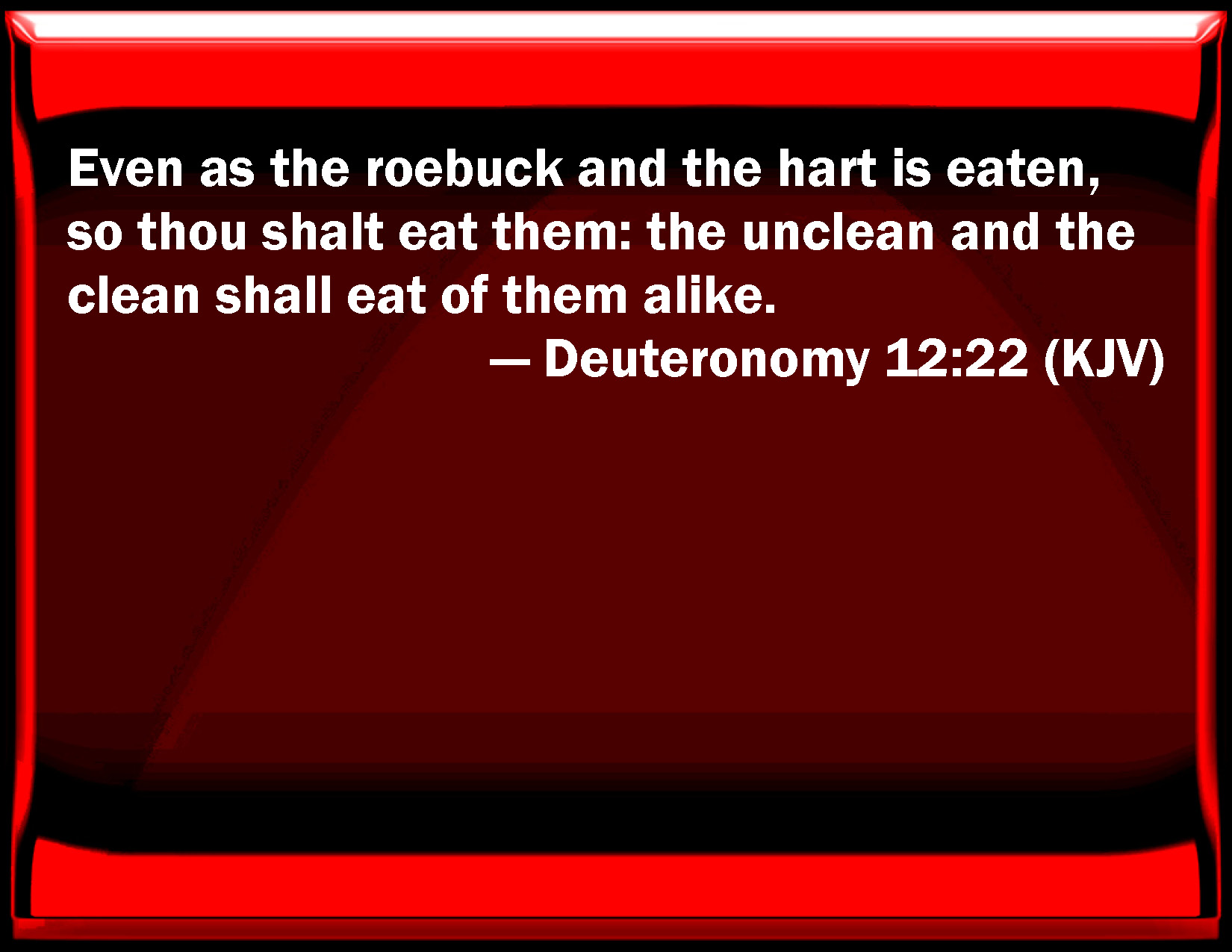 Deuteronomy 12:22 Even as the roebuck and the hart is eaten, so you shall eat them: the unclean and the clean shall eat of them alike.