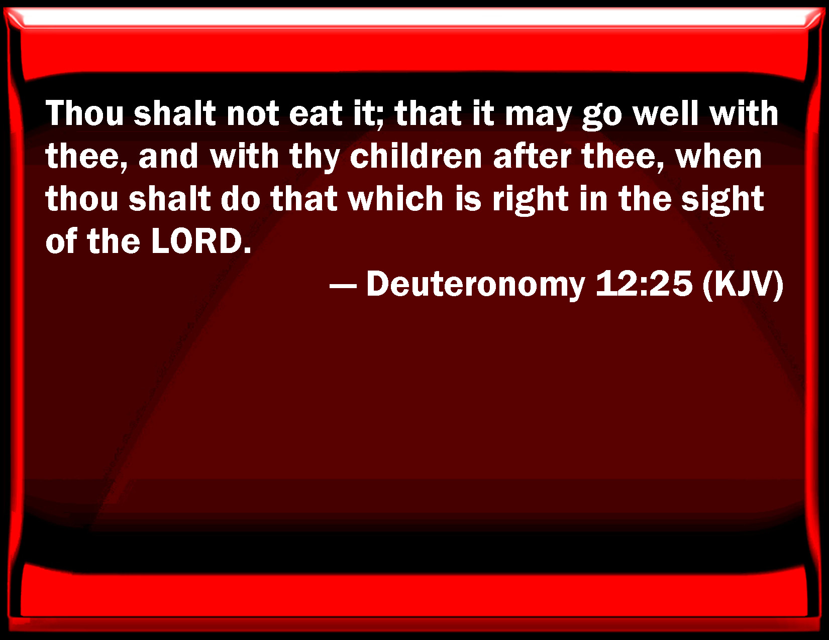 Bible Verse Slide Deuteronomy 12:25 You shall not eat it; that it may go well with you, and with your children after you, when you shall do that which is right in the sight of the LORD. KJV: Thou shalt not eat it; that it may go well with thee, and with thy children after thee, when thou shalt do that which is right in the sight of the LORD. DRB: That it may be well with thee and thy children after thee, when thou shalt do that which is pleasing in the sight of the Lord. DBT: thou shalt not eat it; that it may go well with thee, and with thy children after thee, when thou shalt do what is right in the eyes of Jehovah. ERV: Thou shalt not eat it; that it may go well with thee, and with thy children after thee, when thou shalt do that which is right in the eyes of the LORD. WBT: Thou shalt not eat it; that it may be well with thee, and with thy children after thee, when thou shalt do that which is right in the sight of the LORD. WEB: You shall not eat it; that it may go well with you, and with your children after you, when you shall do that which is right in the eyes of Yahweh. YLT: thou dost not eat it, in order that it may be well with thee, and with thy sons after thee, when thou dost that which is right in the eyes of Jehovah.Links Deuteronomy 12:25 NIV • Deuteronomy 12:25 NLT • Deuteronomy 12:25 ESV • Deuteronomy 12:25 NASB • Deuteronomy 12:25 KJV • Deuteronomy 12:25 Interlinear • Deuteronomy 12:25 Commentaries • Deuteronomy 12:25 Parallel Texts • Deuteronomy 12:25 Bible Apps • Deuteronomy 12:25 Parallel • Bible Hub |