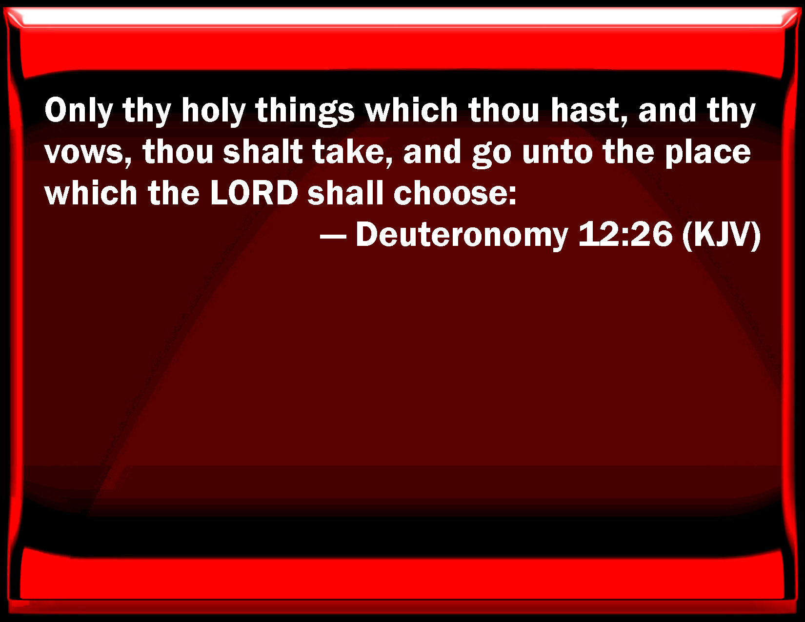 Bible Verse Slide Deuteronomy 12:26 Only your holy things which you have, and your vows, you shall take, and go to the place which the LORD shall choose: KJV: Only thy holy things which thou hast, and thy vows, thou shalt take, and go unto the place which the LORD shall choose: DRB: But the things which thou hast sanctified and vowed to the Lord, thou shalt take, and shalt come to the place which the Lord shall choose: DBT: But thy hallowed things which thou hast, and what thou hast vowed, thou shalt take, and come to the place which Jehovah will choose; ERV: Only thy holy things which thou hast, and thy vows, thou shalt take, and go unto the place which the LORD shall choose: WBT: Only thy holy things which thou hast, and thy vows, thou shalt take, and go to the place which the LORD shall choose: WEB: Only your holy things which you have, and your vows, you shall take, and go to the place which Yahweh shall choose: YLT: 'Only, thy holy things which thou hast, and thy vows, thou dost take up, and hast gone in unto the place which Jehovah doth choose,Links Deuteronomy 12:26 NIV • Deuteronomy 12:26 NLT • Deuteronomy 12:26 ESV • Deuteronomy 12:26 NASB • Deuteronomy 12:26 KJV • Deuteronomy 12:26 Interlinear • Deuteronomy 12:26 Commentaries • Deuteronomy 12:26 Parallel Texts • Deuteronomy 12:26 Bible Apps • Deuteronomy 12:26 Parallel • Bible Hub |