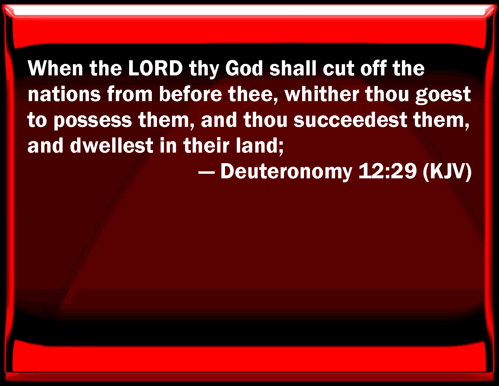 Bible Verse Slide Deuteronomy 12:29 When the LORD your God shall cut off the nations from before you, where you go to possess them, and you succeed them, and dwell in their land; KJV: When the LORD thy God shall cut off the nations from before thee, whither thou goest to possess them, and thou succeedest them, and dwellest in their land; DRB: When the Lord thy God shall have destroyed before thy face the nations, which then shalt go in to possess, and when thou shalt possess them, and dwell in their land: DBT: When Jehovah thy God cutteth off from before thee the nations whither thou goest, to take possession of them, and thou hast dispossessed them, and dwellest in their land, ERV: When the LORD thy God shall cut off the nations from before thee, whither thou goest in to possess them, and thou possessest them, and dwellest in their land; WBT: When the LORD thy God shall cut off the nations from before thee, whither thou goest to possess them, and thou succeedest them, and dwellest in their land; WEB: When Yahweh your God shall cut off the nations from before you, where you go in to dispossess them, and you dispossess them, and dwell in their land; YLT: When Jehovah thy God doth cut off the nations — whither thou art going in to possess them — from thy presence, and thou hast possessed them, and hast dwelt in their land — Links Deuteronomy 12:29 NIV • Deuteronomy 12:29 NLT • Deuteronomy 12:29 ESV • Deuteronomy 12:29 NASB • Deuteronomy 12:29 KJV • Deuteronomy 12:29 Interlinear • Deuteronomy 12:29 Commentaries • Deuteronomy 12:29 Parallel Texts • Deuteronomy 12:29 Bible Apps • Deuteronomy 12:29 Parallel • Bible Hub |