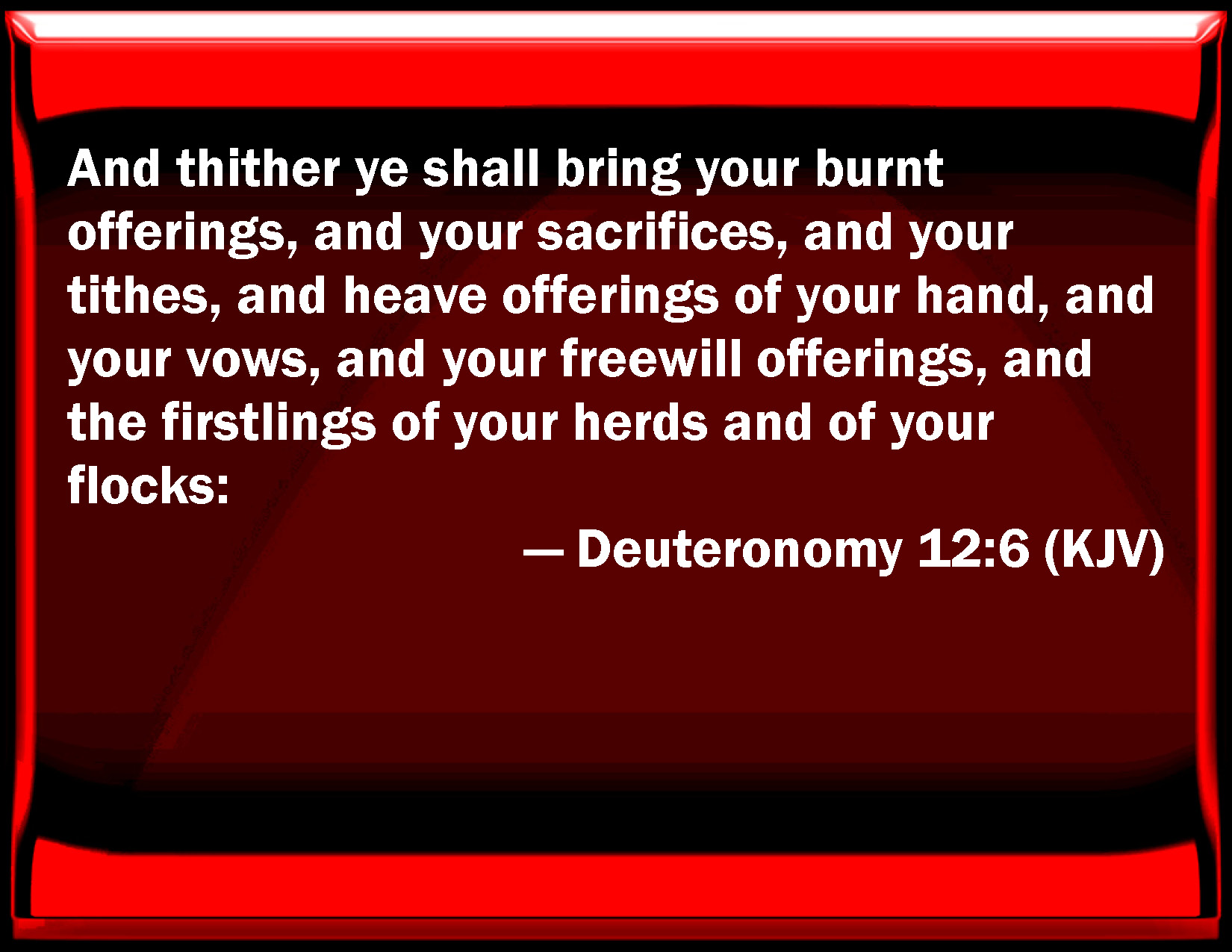 Bible Verse Slide Deuteronomy 12:6 And thither you shall bring your burnt offerings, and your sacrifices, and your tithes, and heave offerings of your hand, and your vows, and your freewill offerings, and the firstborn of your herds and of your flocks: KJV: And thither ye shall bring your burnt offerings, and your sacrifices, and your tithes, and heave offerings of your hand, and your vows, and your freewill offerings, and the firstlings of your herds and of your flocks: DRB: And you shall offer in that place your holocausts and victims, the tithes and firstfruits of your hands and your vows and gifts, the firstborn of your herds and your sheep. DBT: and thither ye shall bring your burnt-offerings and your sacrifices, and your tithes, and the heave-offering of your hand, and your vows, and your voluntary-offerings, and the firstlings of your kine and of your sheep; ERV: and thither ye shall bring your burnt offerings, and your sacrifices, and your tithes, and the heave offering of your hand, and your vows, and your freewill offerings, and the firstlings of your herd and of your flock: WBT: And thither ye shall bring your burnt-offerings, and your sacrifices, and your tithes, and heave-offerings of your hand, and your vows, and your free-will-offerings, and the firstlings of your herds, and of your flocks: WEB: and there you shall bring your burnt offerings, and your sacrifices, and your tithes, and the wave offering of your hand, and your vows, and your freewill offerings, and the firstborn of your herd and of your flock: YLT: and hast brought in thither your burnt-offerings, and your sacrifices, and your tithes, and the heave-offering of your hand, and your vows, and your free-will offerings, and the firstlings of your herd and of your flock;Links Deuteronomy 12:6 NIV • Deuteronomy 12:6 NLT • Deuteronomy 12:6 ESV • Deuteronomy 12:6 NASB • Deuteronomy 12:6 KJV • Deuteronomy 12:6 Interlinear • Deuteronomy 12:6 Commentaries • Deuteronomy 12:6 Parallel Texts • Deuteronomy 12:6 Bible Apps • Deuteronomy 12:6 Parallel • Bible Hub |