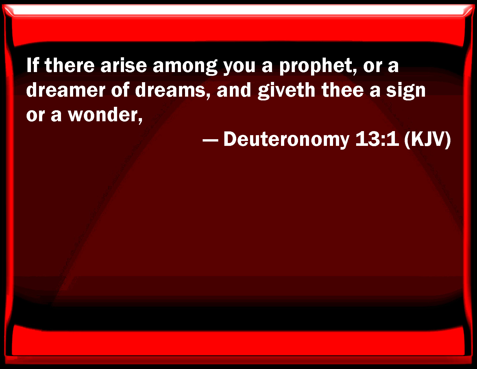 Bible Verse Slide Deuteronomy 13:1 If there arise among you a prophet, or a dreamer of dreams, and gives you a sign or a wonder, KJV: If there arise among you a prophet, or a dreamer of dreams, and giveth thee a sign or a wonder, DRB: If there rise in the midst of thee a prophet or one that saith he hath dreamed a dream, and he foretell a sign and a wonder, DBT: If there arise among you a prophet, or one that dreameth dreams, and he give thee a sign or a wonder, ERV: If there arise in the midst of thee a prophet, or a dreamer of dreams, and he give thee a sign or a wonder, WBT: If there shall arise among you a prophet, or a dreamer of dreams, and give thee a sign or a wonder. WEB: If there arise in the midst of you a prophet, or a dreamer of dreams, and he give you a sign or a wonder, YLT: 'When there ariseth in your midst a prophet, or a dreamer of a dream, and he hath given unto thee a sign or wonder,Links Deuteronomy 13:1 NIV • Deuteronomy 13:1 NLT • Deuteronomy 13:1 ESV • Deuteronomy 13:1 NASB • Deuteronomy 13:1 KJV • Deuteronomy 13:1 Interlinear • Deuteronomy 13:1 Commentaries • Deuteronomy 13:1 Parallel Texts • Deuteronomy 13:1 Bible Apps • Deuteronomy 13:1 Parallel • Bible Hub |