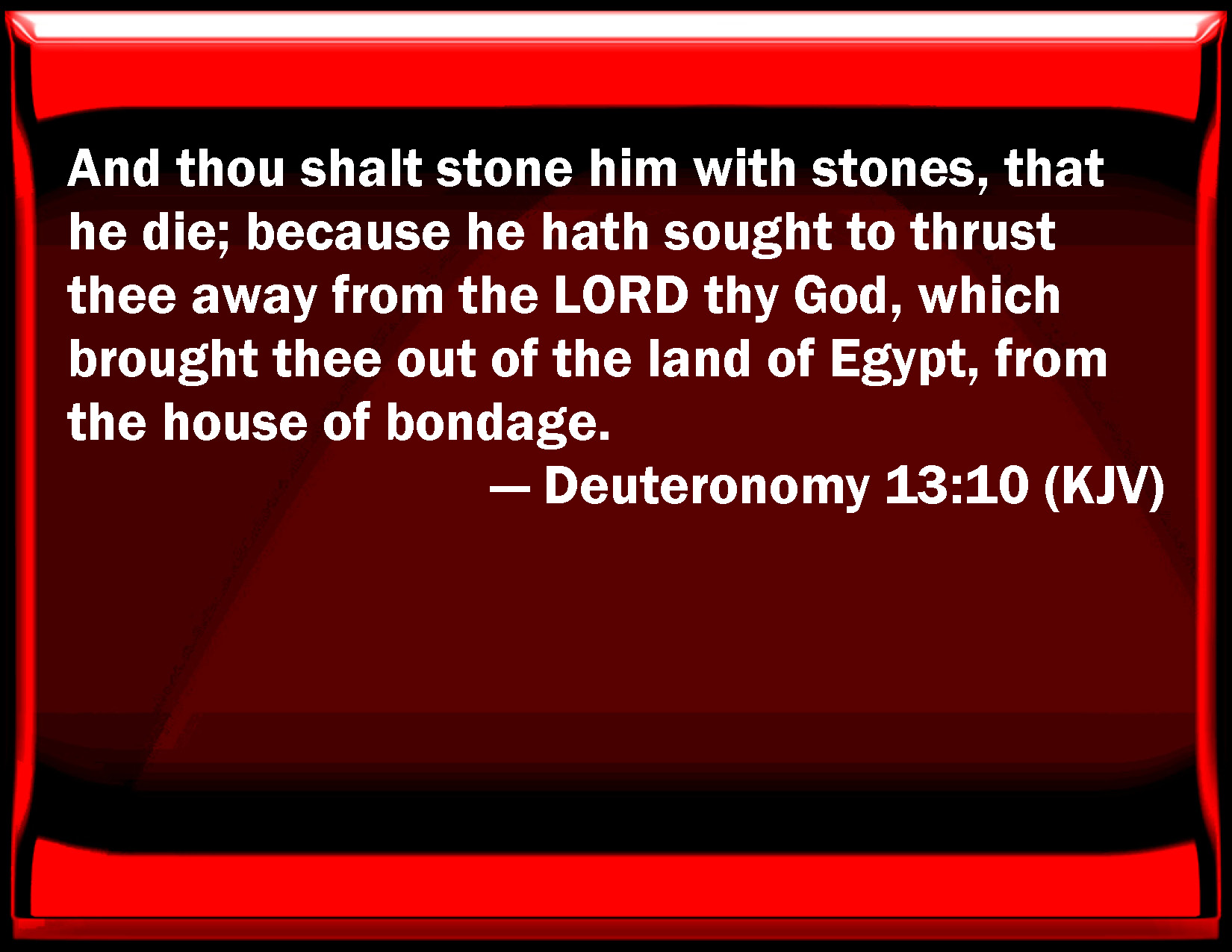 Bible Verse Slide Deuteronomy 13:10 And you shall stone him with stones, that he die; because he has sought to thrust you away from the LORD your God, which brought you out of the land of Egypt, from the house of bondage. KJV: And thou shalt stone him with stones, that he die; because he hath sought to thrust thee away from the LORD thy God, which brought thee out of the land of Egypt, from the house of bondage. DRB: With stones shall he be stoned to death: because he would have withdrawn thee from the Lord thy God, who brought thee out of the land of Egypt, from the house of bondage: DBT: and thou shalt stone him with stones, that he die; for he hath sought to draw thee away from Jehovah thy God who brought thee out of the land of Egypt, out of the house of bondage; ERV: And thou shalt stone him with stones, that he die; because he hath sought to draw thee away from the LORD thy God, which brought thee out of the land of Egypt, out of the house of bondage. WBT: And thou shalt stone him with stones that he shall die; because he hath sought to thrust thee away from the LORD thy God, who brought thee out of the land of Egypt from the house of bondage. WEB: You shall stone him to death with stones, because he has sought to draw you away from Yahweh your God, who brought you out of the land of Egypt, out of the house of bondage. YLT: and thou hast stoned him with stones, and he hath died, for he hath sought to drive thee away from Jehovah thy God, who is bringing thee out of the land of Egypt, out of a house of servants;Links Deuteronomy 13:10 NIV • Deuteronomy 13:10 NLT • Deuteronomy 13:10 ESV • Deuteronomy 13:10 NASB • Deuteronomy 13:10 KJV • Deuteronomy 13:10 Interlinear • Deuteronomy 13:10 Commentaries • Deuteronomy 13:10 Parallel Texts • Deuteronomy 13:10 Bible Apps • Deuteronomy 13:10 Parallel • Bible Hub |