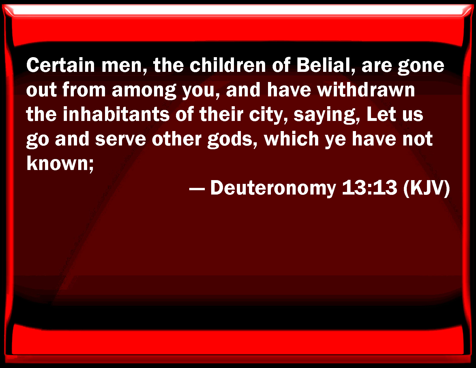 Bible Verse Slide Deuteronomy 13:13 Certain men, the children of Belial, are gone out from among you, and have withdrawn the inhabitants of their city, saying, Let us go and serve other gods, which you have not known; KJV: Certain men, the children of Belial, are gone out from among you, and have withdrawn the inhabitants of their city, saying, Let us go and serve other gods, which ye have not known; DRB: Children of Belial are gone out of the midst of thee, and have withdrawn the inhabitants of their city, and have said: Let us go, and serve strange gods which you know not: DBT: There are men, children of Belial, gone out from among you, and they have drawn away the inhabitants of their city, saying, Let us go and serve other gods, whom ye have not known; ERV: Certain base fellows are gone out from the midst of thee, and have drawn away the inhabitants of their city, saying, Let us go and serve other gods, which ye have not known; WBT: Certain men, the children of Belial, have gone out from among you, and have withdrawn the inhabitants of their city, saying, Let us go and serve other gods, which ye have not known; WEB: Certain base fellows are gone out from the midst of you, and have drawn away the inhabitants of their city, saying, "Let us go and serve other gods," which you have not known; YLT: Men, sons of worthlessness, have gone out of thy midst, and they force away the inhabitants of their city, saying, Let us go and serve other gods, which ye have not known — Links Deuteronomy 13:13 NIV • Deuteronomy 13:13 NLT • Deuteronomy 13:13 ESV • Deuteronomy 13:13 NASB • Deuteronomy 13:13 KJV • Deuteronomy 13:13 Interlinear • Deuteronomy 13:13 Commentaries • Deuteronomy 13:13 Parallel Texts • Deuteronomy 13:13 Bible Apps • Deuteronomy 13:13 Parallel • Bible Hub |